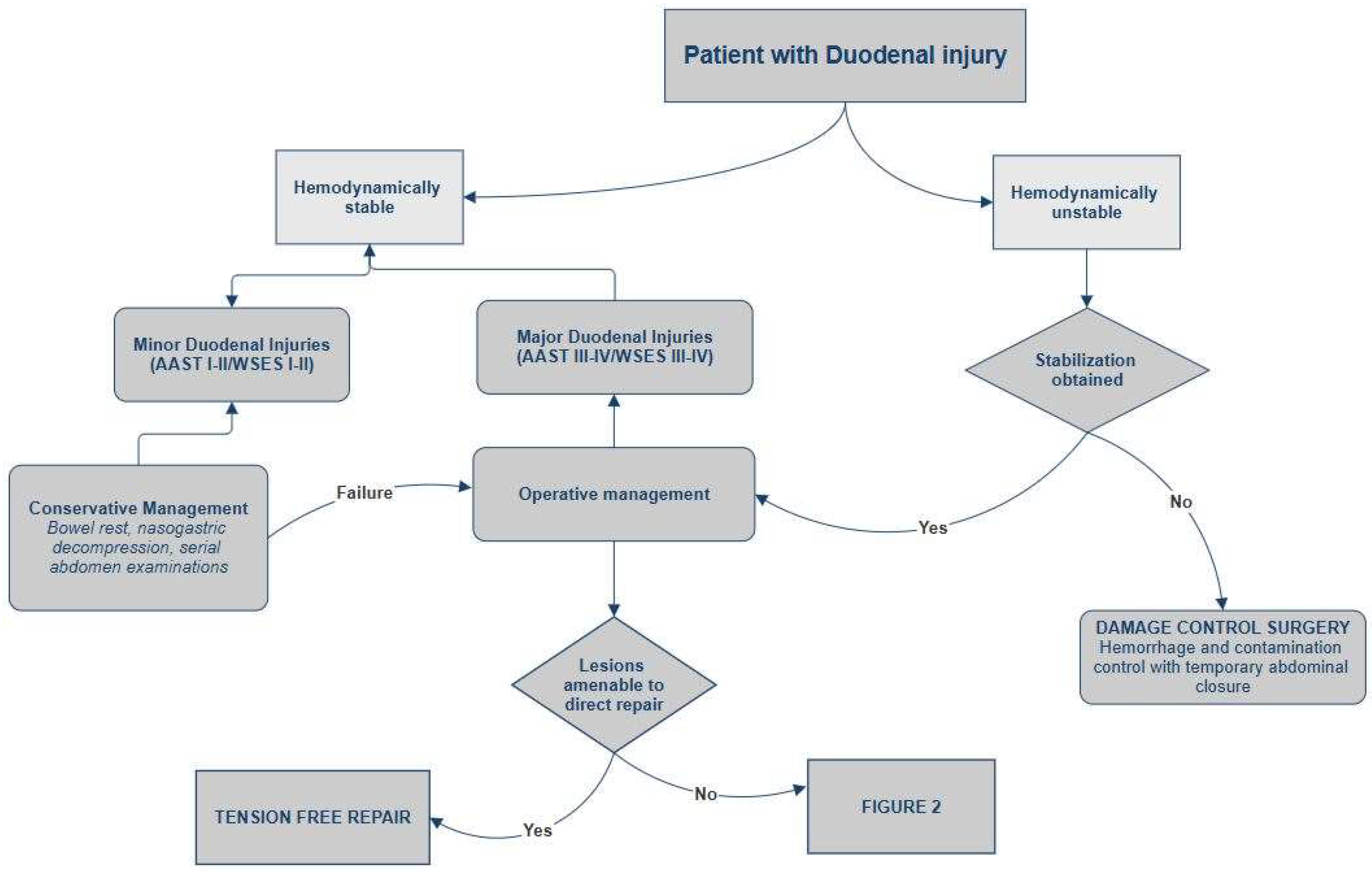 | Minor | WSES Class I | I | Stable | Hematoma | Involving single portion of duodenum |