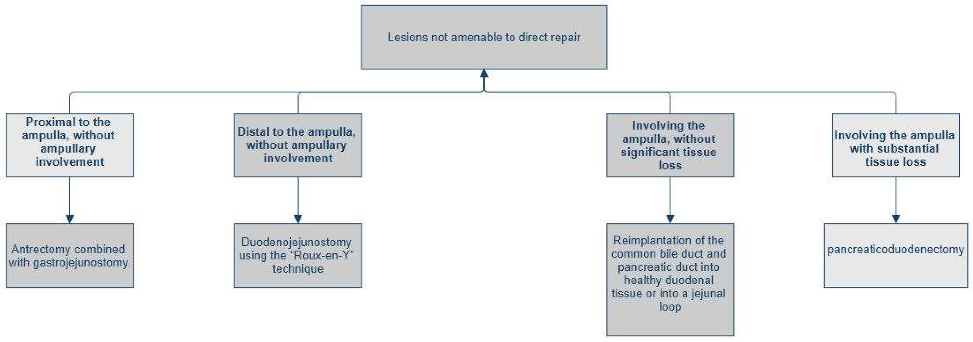 - Lesion involving the ampulla or distal common bile duct (AAST Grade IV), without significant tissue loss: complex reconstruction, which may include the reimplantation of the common bile duct (via choledochoduodenostomy or choledochojejunostomy on a Roux-en-Y limb) and peripancreatic drainage [32].
