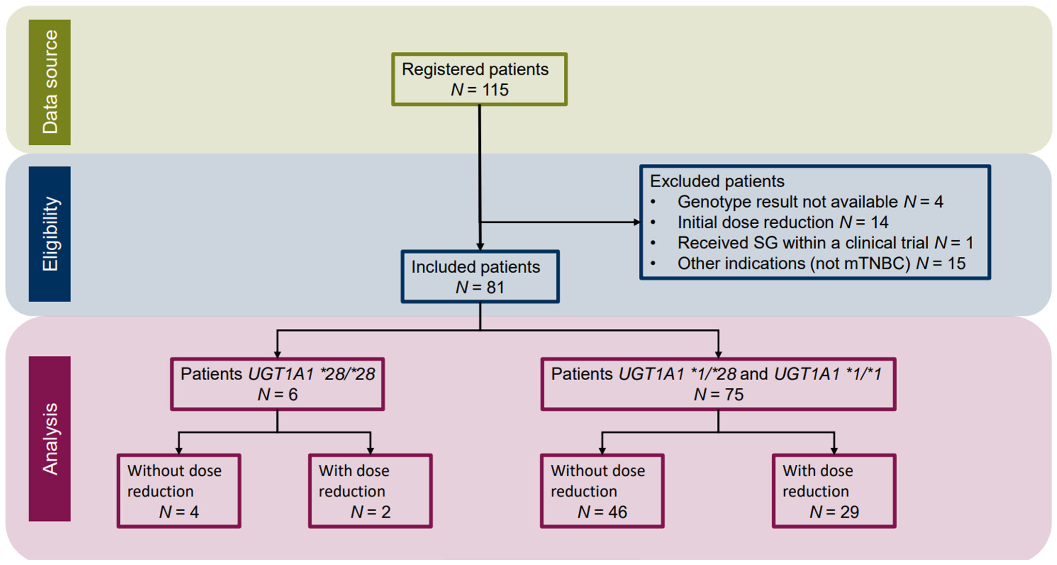 do Pazo-Oubiña, F.; del Rosario García, B.; Miarons, M.; Legido Perdices, E.M.; Prado Mel, E.; Díaz, R.R.; Gutiérrez Nicolás, F.; on behalf of the Estudio Mama-SSG Working Group. Impact of UGT1A1*28 Allele on the Safety and Effectiveness of Sacituzumab Govitecan in Metastatic Triple-Negative Breast Cancer: Real-World Evidence. J. Clin. Med. 2026, 15, 574. https://doi.org/10.3390/jcm15020574