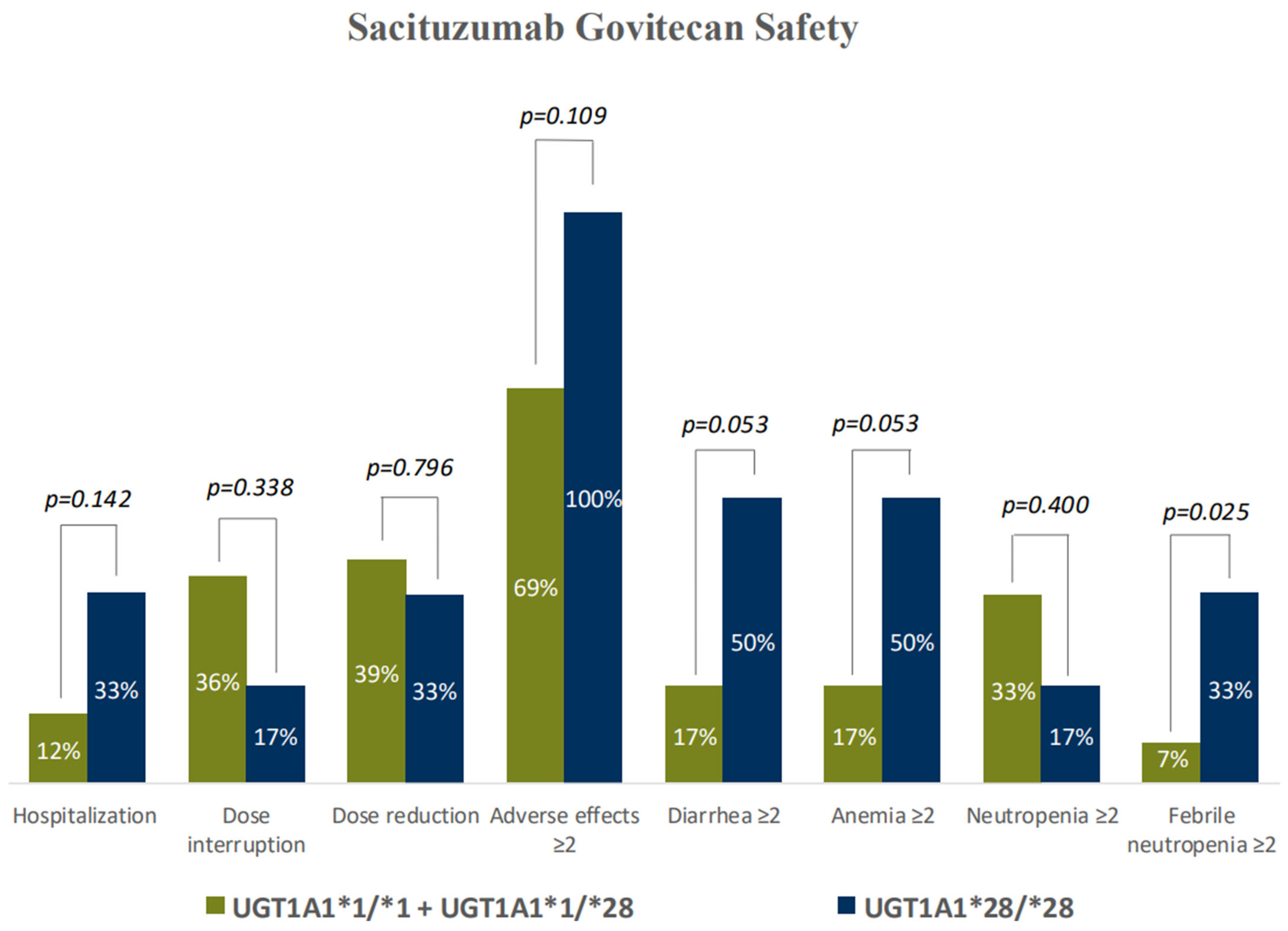 - Wong, M.H.; Jones, V.C.; Yu, W.; Bosserman, L.D.; Lavasani, S.M.; Patel, N.; Sedrak, M.S.; Stewart, D.B.; Waisman, J.R.; Yuan, Y.; et al. UGT1A1*28 polymorphism and the risk of toxicity and disease progression in patients with breast cancer receiving sacituzumab govitecan. Cancer Med. 2024, 13, e70096. [Google Scholar] [CrossRef] [PubMed]