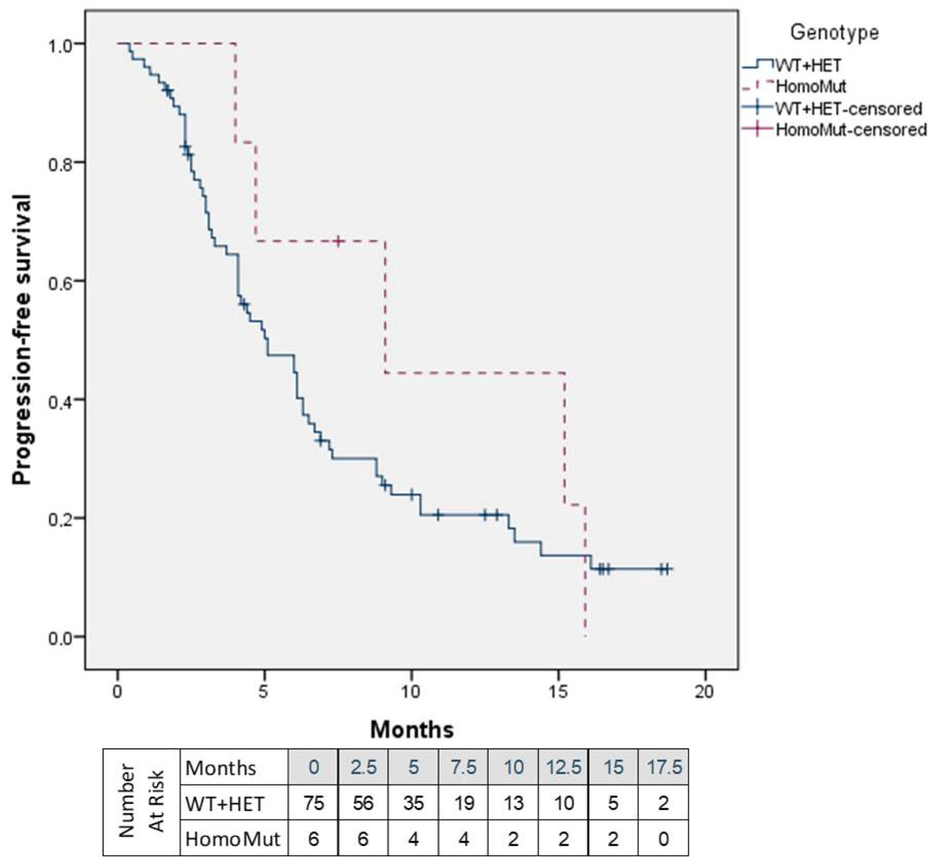 | WT + HET Without dose reduction (N = 46) | 4.1 versus 6.9 (0.015) | 4.1 versus 9.1 (0.225) | 4.1 versus 15.2 (0.121) | |
