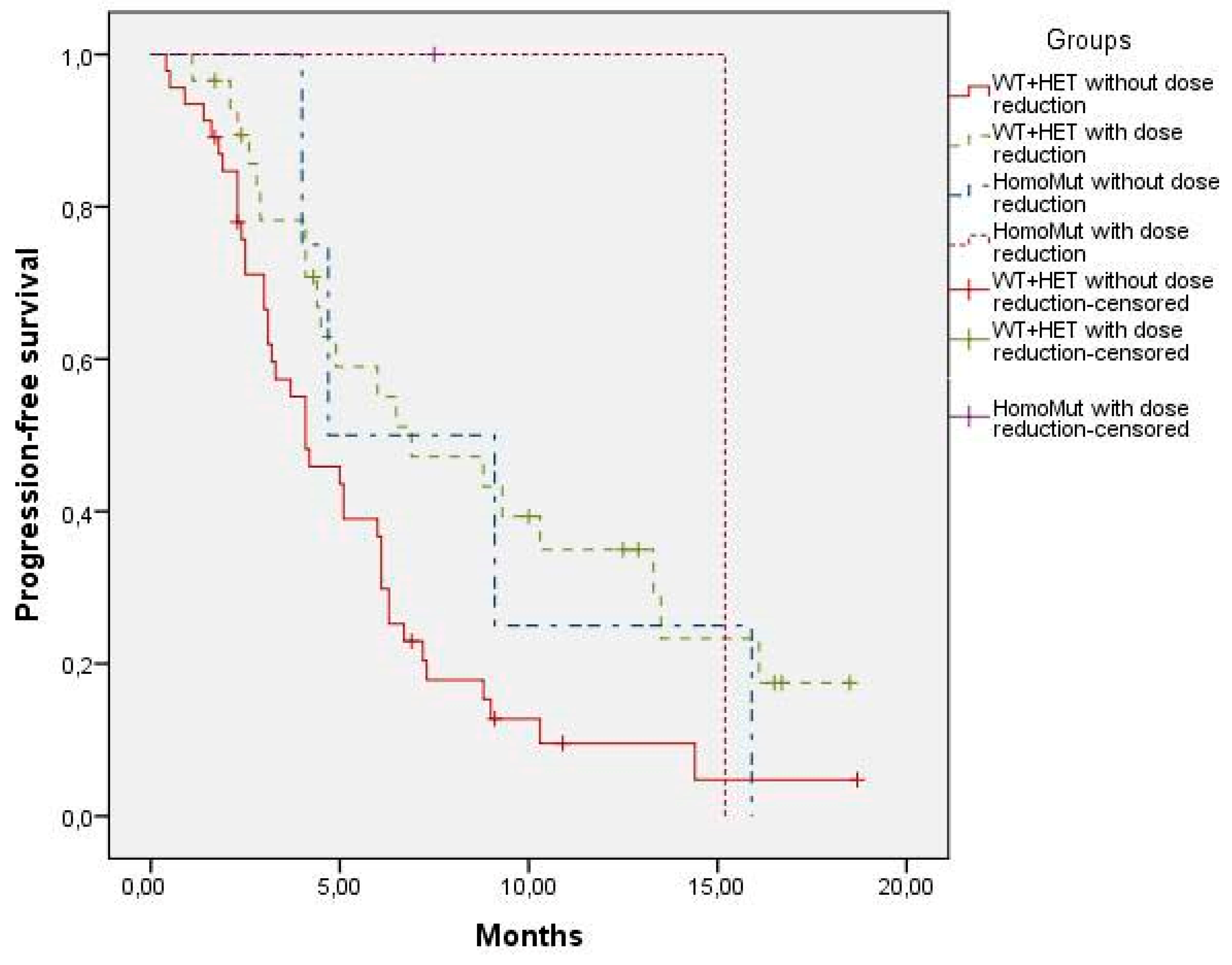 | WT + HET With dose reduction (N = 29) | 6.9 versus 4.1 (0.015) | 6,9 versus 9.1 (0.972) | 6,9 versus 15.2 (0.445) | |