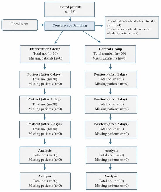 A non-probability convenience sampling method was used to recruit patients scheduled for knee arthroscopy into the intervention and control groups. Initially, 69 patients were assessed for eligibility. Of these, 4 declined to participate, and 5 were excluded based on the predefined eligibility criteria. Consequently, the final study sample comprised 60 participants, with 30 allocated to the intervention group and 30 to the control group. Participants in the control group were recruited first, underwent baseline assessment, and completed post-intervention outcome measures. Subsequently, participants were recruited into the intervention group (Figure 1).