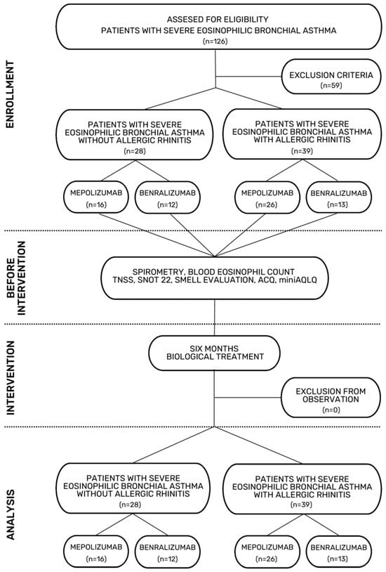In this single-center real-life study, we analyzed the effects of biological anti-IL-5 or anti-IL5R treatment on rhinological symptoms and quality of life in patients over the age of 18 with severe uncontrolled eosinophilic bronchial asthma treated with mepolizumab or benralizumab with coexisting persistent allergic or non-allergic rhinitis. The data of patients treated with mepolizumab or benralizumab at the Department of Internal Medicine, Allergology and Clinical Immunology of the K. Gibinski University Clinical Hospital of the Silesian Medical University in Katowice, Poland were analyzed. Severe bronchial asthma and its eosinophilic phenotype were diagnosed based on the GINA criteria [12]. In accordance with current diagnostic criteria, chronic allergic rhinitis was diagnosed based on concordance between a documented history of symptom onset—including anterior or posterior rhinorrhea, nasal congestion or blockage, nasal pruritus, and sneezing—following allergen exposure and positive skin prick test results. Symptoms must occur more than 4 days per week and for more than 4 consecutive weeks per year. Non-allergic rhinitis was diagnosed in patients presenting with symptoms of rhinitis in the absence of clinical signs of infection and without evidence of systemic allergic sensitization, as indicated by negative skin prick test results to inhalant allergens [13]. The skin prick tests were performed according to the European Academy of Allergy and Clinical Immunology guidelines [14].