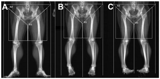 The superior boundary was set at the intertrochanteric line to avoid inclusion of pelvic viscera or fluid-containing compartments, which cannot be reliably differentiated from muscle on DEXA [24]. The inferior boundary was drawn at the level of the patellar upper pole. A vertical center line originating from the symphysis pubis was used as the medial reference, and a parallel vertical line was placed laterally while ensuring that subcutaneous tissue was excluded and the entire thigh musculature remained within the region of interest. Despite adherence to standardized scanning protocols, visual review of DEXA images revealed variability in lower-limb rotation across participants. Because tibial–fibular overlap may influence DEXA-derived values, each scan was categorized into one of three subgroups—external rotation, neutral position, or internal rotation—based on the degree of overlap between the tibia and fibula. The rotation category was determined by an orthopedic surgeon with more than 10 years of specialized experience in knee surgery at a tertiary referral hospital. These groups were used for subsequent analyses (Figure 3). In addition, several patients demonstrated mismatched rotational alignment between the right and left lower limbs (e.g., one limb in external rotation and the contralateral limb in neutral or internal rotation). To account for this discrepancy and prevent misclassification bias, a separate “Mixed” group was created. This group included patients whose bilateral limb rotation on DEXA did not fall within the same positional category.