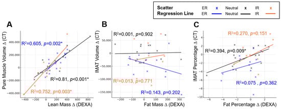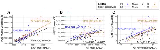 Position-dependent regression characteristics between DEXA-derived body composition metrics and CT-based reference measurements. Panels illustrate changes in regression slopes and model fit across external rotation, neutral, and internal rotation positions. Scatter plots and simple linear regression lines are shown for each position (External rotation = blue, Neutral = black, Internal rotation = orange): (A) Linear regression between DEXA lean mass and CT pure muscle volume. (B) Linear regression between DEXA fat mass and CT IMAT volume. (C) Linear regression between DEXA fat percentage and CT IMAT percentage. Across all analyses, regression slopes and explanatory power varied according to limb position, demonstrating the positional sensitivity of DEXA measurements compared with CT-based reference standards. An asterisk (*) indicates a statistically significant difference (p < 0.05).