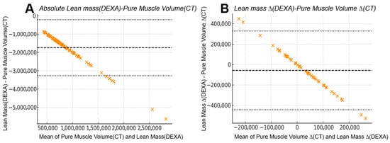 Bland–Altman comparison between CT-derived pure muscle volume and DEXA-derived lean mass: (A) Absolute measurements from 104 limbs showed a mean bias of −1.75 × 106 units with wide 95% limits of agreement from −3.28 × 106 to −0.22 × 106, indicating substantial numerical disagreement between the two modalities despite their strong linear correlation. (B) Inter-limb differences (right–left) from 52 patients demonstrated markedly improved agreement, with the mean bias reduced to −5.76 × 104 units and narrower 95% limits of agreement (−4.43 × 105 to +3.28 × 105). The narrower limits of agreement in inter-limb differences reflect a reduced influence of systemic components that affect absolute DEXA measurements, resulting in improved correspondence with CT-derived asymmetry after subtraction.