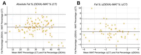 Bland–Altman agreement between CT-derived IMAT percentage and DEXA fat percentage: (A) Absolute analysis demonstrated limited agreement, with a mean bias of +0.91% and wide limits of agreement (−3.96% to +5.78%), indicating substantial numerical variability between modalities when quantifying absolute intramuscular adiposity. (B) Inter-limb differences showed improved consistency, with narrower scatter and the same bias (+0.91%) and limits of agreement (−3.96% to +5.78%) when evaluating asymmetry. The improved consistency in inter-limb differences reflects a reduced influence of systemic factors that affect absolute DEXA values, resulting in closer correspondence with CT-derived asymmetry when right–left subtraction is applied.