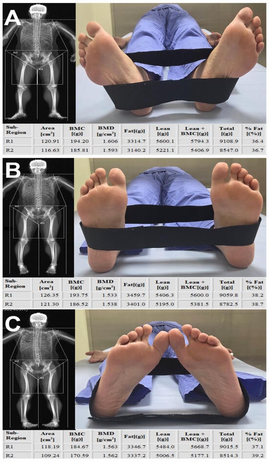 Effect of lower-limb rotation on DEXA-derived measurements. In the same patient, DEXA scans were obtained consecutively on the same day without an interval while the lower limb was positioned in (A) external rotation, (B) neutral alignment, and (C) internal rotation. The comparison demonstrates that DEXA-derived values within the segmented thigh region change substantially with limb rotation. R1 indicates left thigh segmentation, and R2 indicates right thigh segmentation on DEXA imaging.