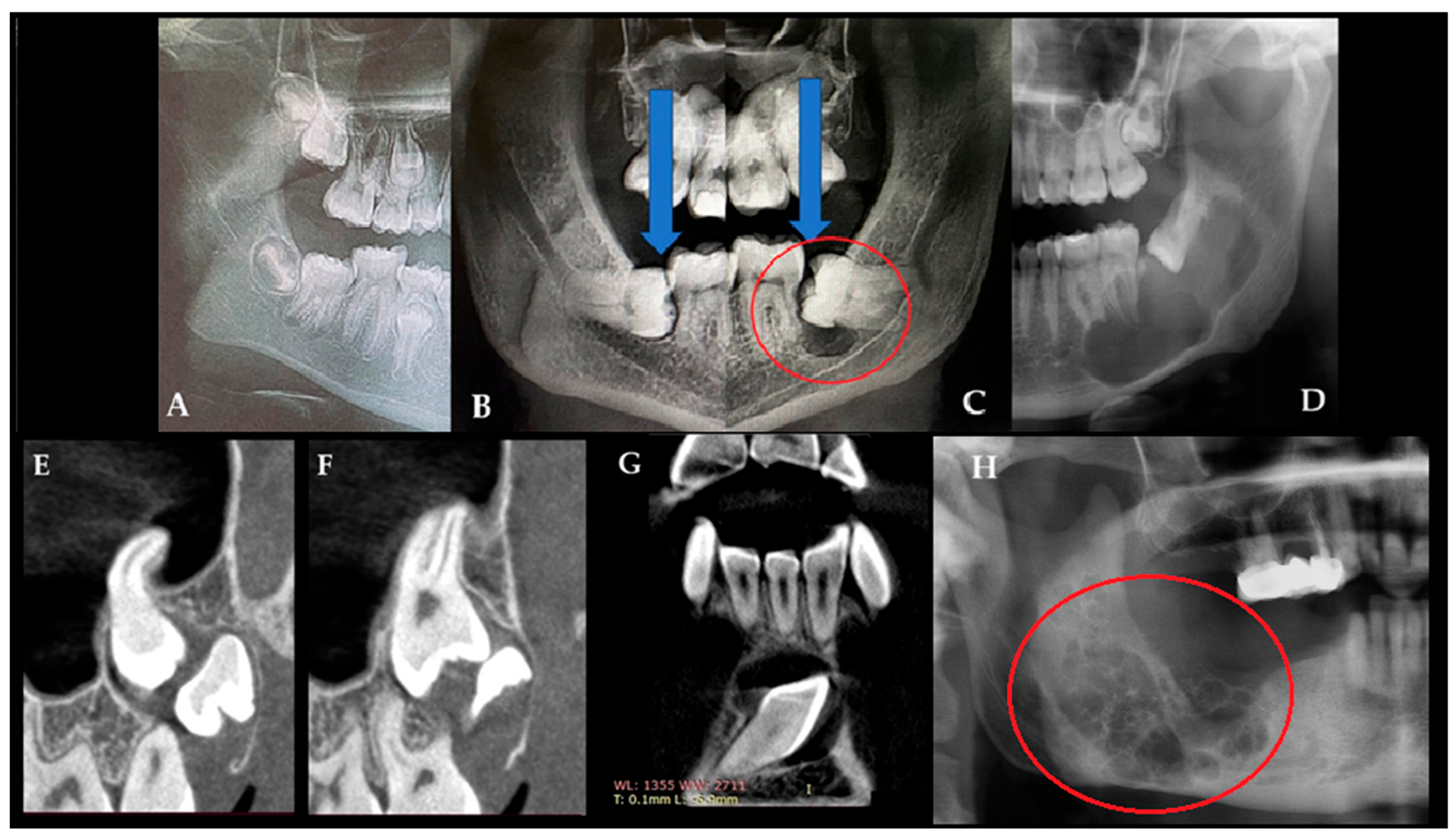 CBCT grants more valuable radiological data than a classic, routinely performed panoramic radiograph. Some worrisome radiological factors related to bone lesion irregularities and the presence of bone septa with or without some ossification within the cystic lesion, followed by teeth resorption, cortical swelling, and extracortical spread, might help in initial diagnostics. Furthermore, when a lesion is growing towards and within a maxillary sinus, some other sinus-related symptoms might occur. These can be more easily identified using CBCT rather than a classic radiograph. In the presented case, the asymmetry and increased radiolucent area behind a partially unerupted tooth indicated a follicular cyst. After improved diagnostics, CBCT followed by a histopathological specimen examination influenced the final diagnosis, especially because early OM growth patterns without any other radiological or clinical symptoms might mimic follicular cysts or merely the presence of a swollen, asymmetrical dental follicle.