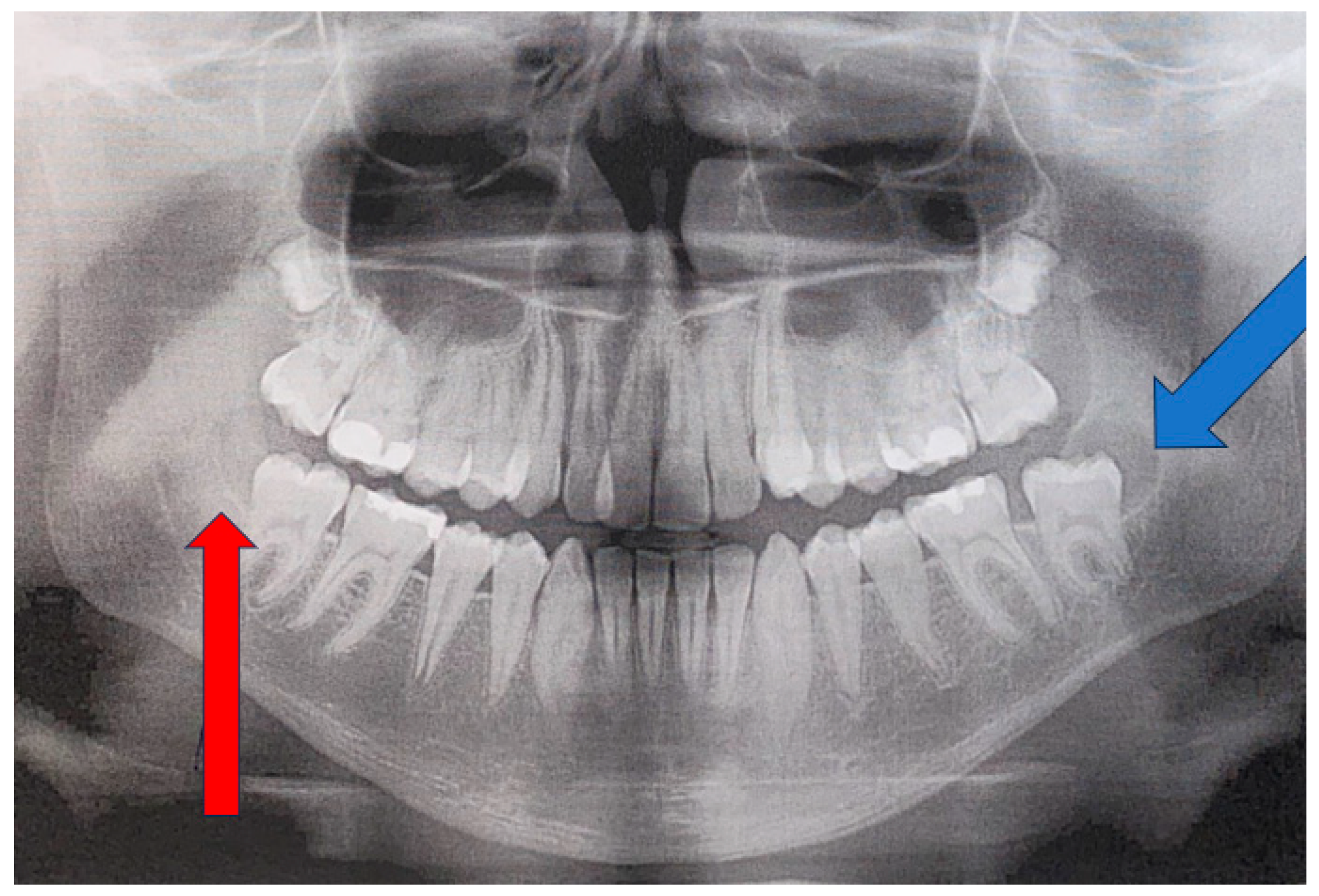 14]. Routinely used OPG is quite a valuable diagnostic tool for finding any early-stage bone lesions, cysts, and tumors, and it can also be used for diagnostics with respect to teeth position, jawbone anomalies, and estimations of the dento-alveolar status of juvenile patients just before planned orthodontic treatment [