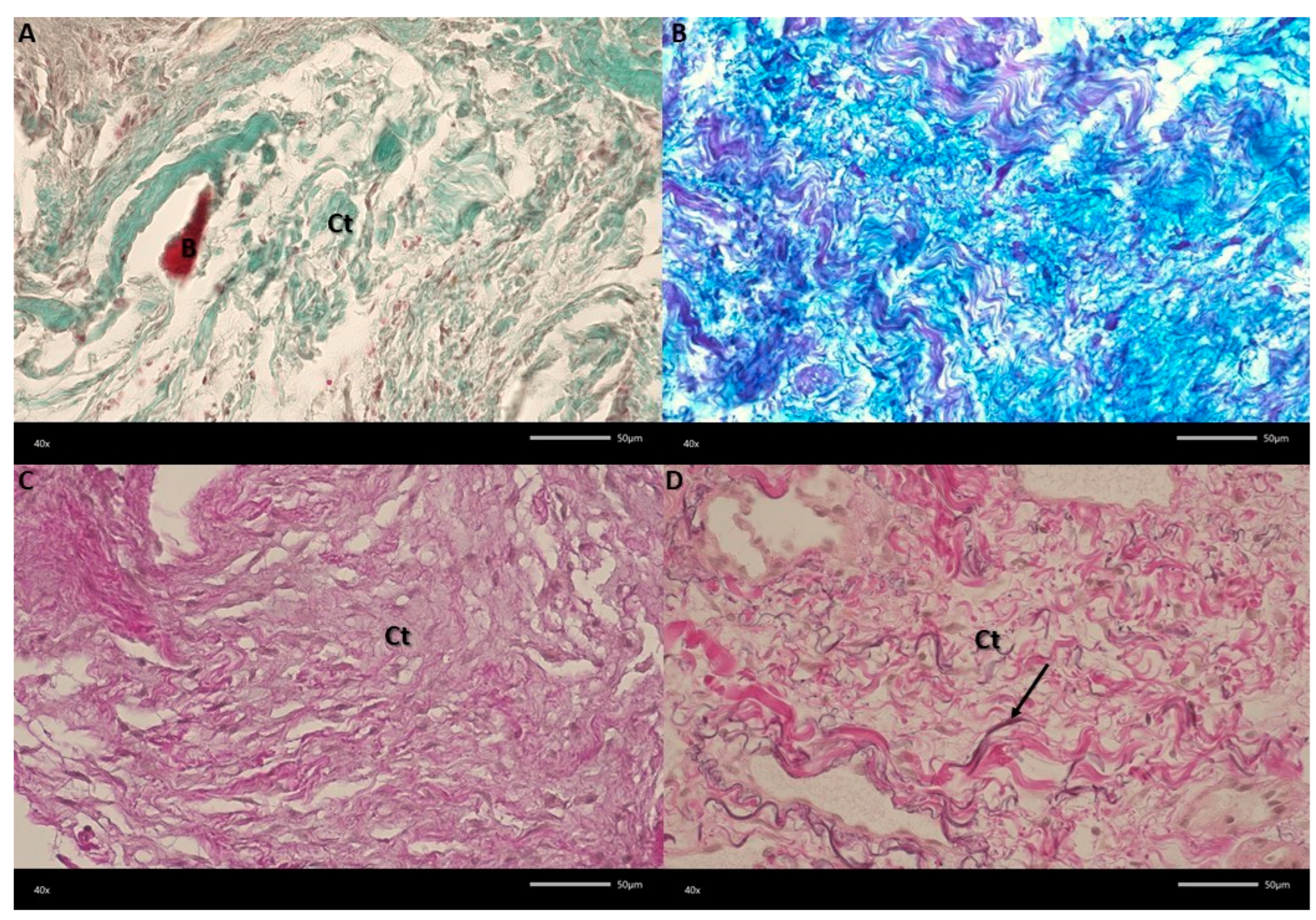 The material was fixed for 72 h in a 4% buffered formaldehyde solution (pH 7.2–7.4). Tissues were washed in running water for 24 h, after which the sections were dehydrated by placing them in ethanol dilutions of increasing concentration. After impregnating them with paraffin, they were embedded in blocks. Tissues were cut into 7 μm thick sections and stained classically with hematoxylin and eosin (H&E), Alcian blue-PAS, Van Gieson for elastic fibers, and Masson–Goldner stain. All reagents were purchased from Merck KGaA (Darmstadt, Germany). The evaluation of histological preparations was performed using a Nikon Eclipse 80i microscope (Nikon, Tokyo, Japan) and a Jenoptik Gryphax