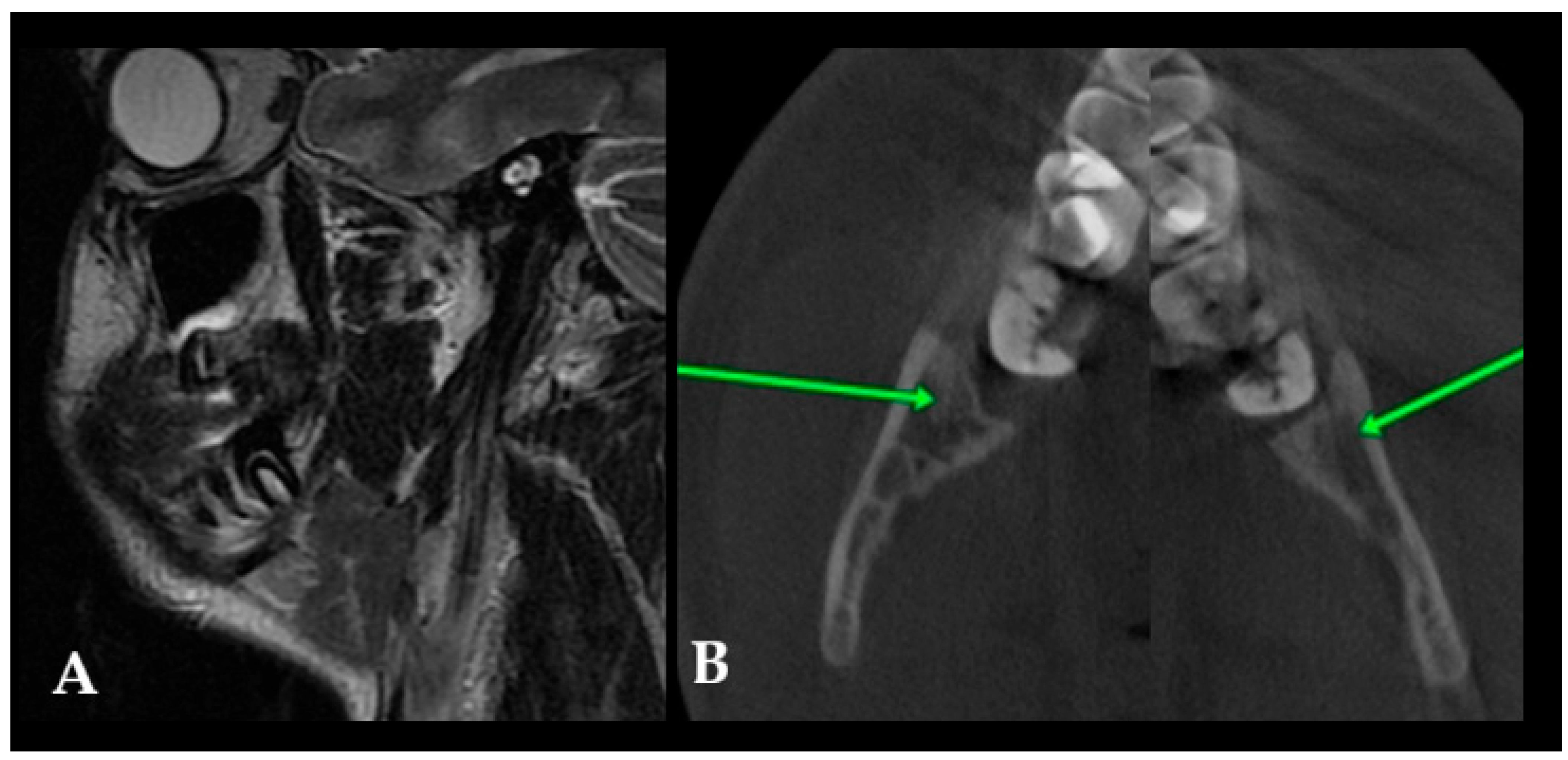 Figure 6A). A satisfactory surgical outcome was achieved, with no radiographic evidence of recurrence or additional bone involvement. After surgery, a combination of MR-CBCT and MR-CT evaluations every six months for a year was conducted, and then, they were conducted once a year. This step was quite important for early detection of any relapse or secondary manifestation of OMs. The green arrows in