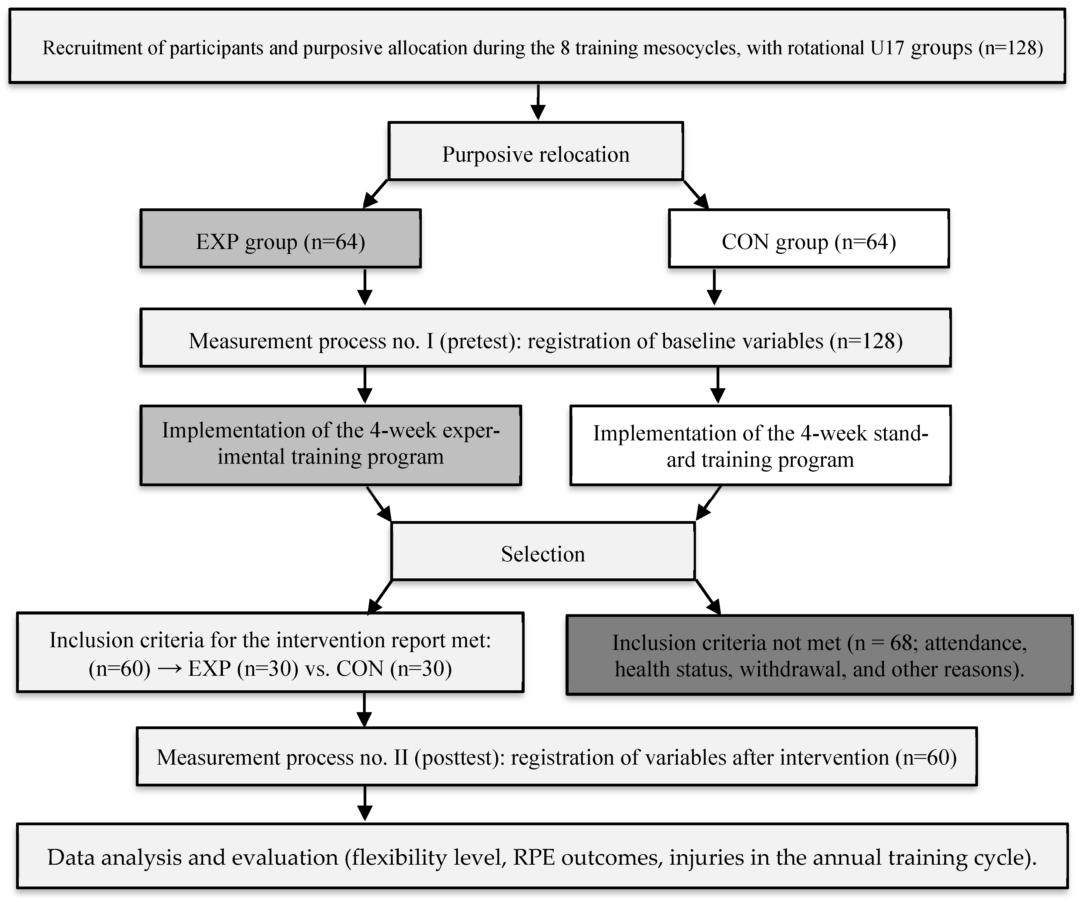 10]. The multi-stage longitudinal study was conducted as an experiment over 8 mesocycles (1 mesocycle—a 4-week training plan), annually over a period of 8 years (2015–2019 and 2022–2024), totaling 8 months of training. Additionally, in each of the mesocycles, an independent group of U17 players (rotational groups) was selected based on uniform inclusion criteria (age, skill level, discipline). The selection for the experimental group (EXP) and control group (CON) was done separately in each mesocycle, adhering to the age range of the participants (U17—age from 16 to completion of 17 years). The U17 age category was selected because it represents a crucial developmental period for young athletes, particularly in football. At this age, players undergo significant physical and psychological changes that affect their ability to achieve high performance. Training during this period is key to establishing long-term athletic development, and properly planned warm-up and cool-down routines may provide substantial benefits in terms of injury prevention and performance optimization. This allowed for averaging results between groups and assessing the overall effect of the intervention in the athlete population, as presented in the report. The testing procedure was carried out before and after each 4-week experimental intervention period. The level of flexibility, subjective assessment of exercise intensity (RPE), and the injury profile of the lower limbs in the annual training cycle were verified. In the EXP group, the intervention was integrated into their regular training program, supplemented with special exercises in the initial and final parts of the training session (targeted heart rate frequency and exercise content). The CON group followed their standard training program. The experimental stimulus was applied to reliably compare the training effects obtained with the rational warm-up conditions against the effects of traditional methods commonly used in sports clubs.