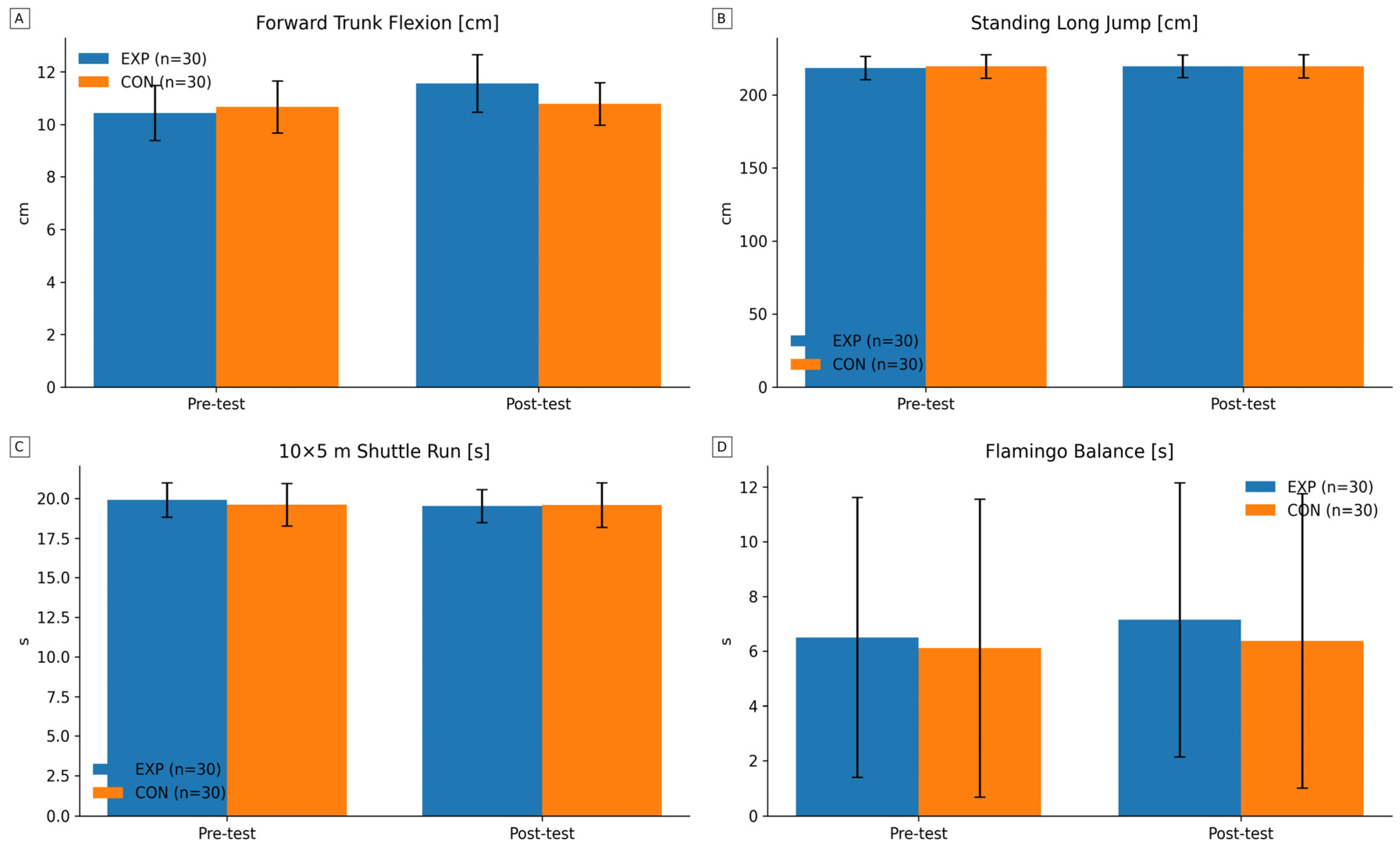 Following the intervention period (post-test), a significant improvement in flexibility was observed in the EXP group, while no significant changes were noted in the CON group. The intergroup analysis showed that, after the intervention, the EXP group achieved a significantly higher score compared with the CON group, confirming the effectiveness of the applied program in developing flexibility. The low coefficient of variation values (CV 9–10%) indicate high measurement repeatability and homogeneity of the tested sample.