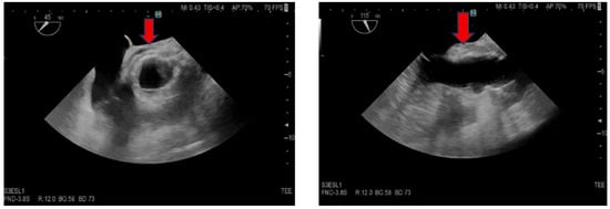 Upon admission, laboratory investigations revealed elevated inflammatory parameters and leukocyte count (detailed in Table 1). ECG and chest X-ray showed no significant abnormalities, with no evidence of pulmonary changes. Transesophageal echocardiography demonstrated tissue thickening in the aortic root (Figure 1), while the aortic valve appeared normal without regurgitation or stenosis. Blood cultures for aerobes and anaerobes were collected at 30 min intervals, and empiric treatment for early autograft endocarditis was initiated according to current ESC guidelines [11], consisting of vancomycin, gentamicin, and rifampicin.