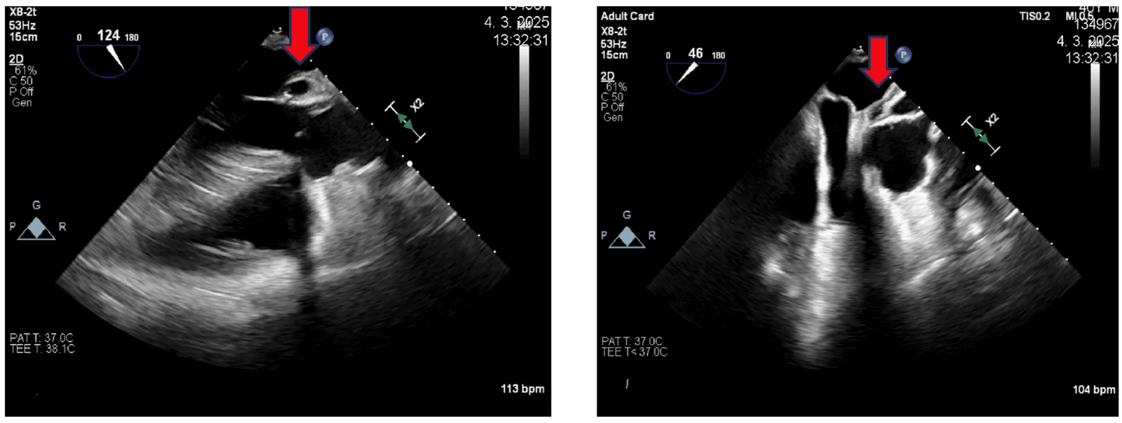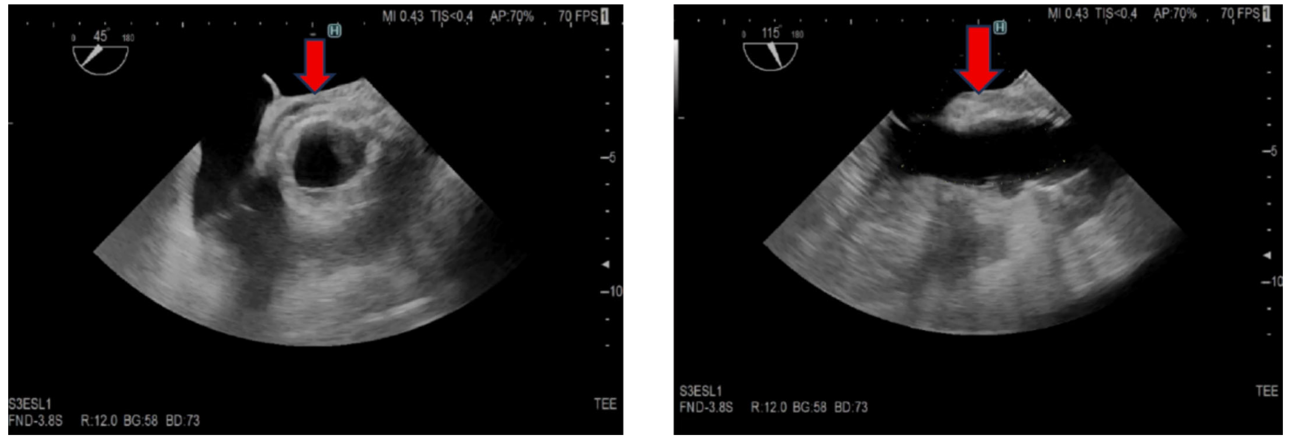 Figure 1. Transesophageal echocardiography, short and long axis of the aorta. The red arrow indicates thickened tissue in the aortic root area, suggestive of an abscess.