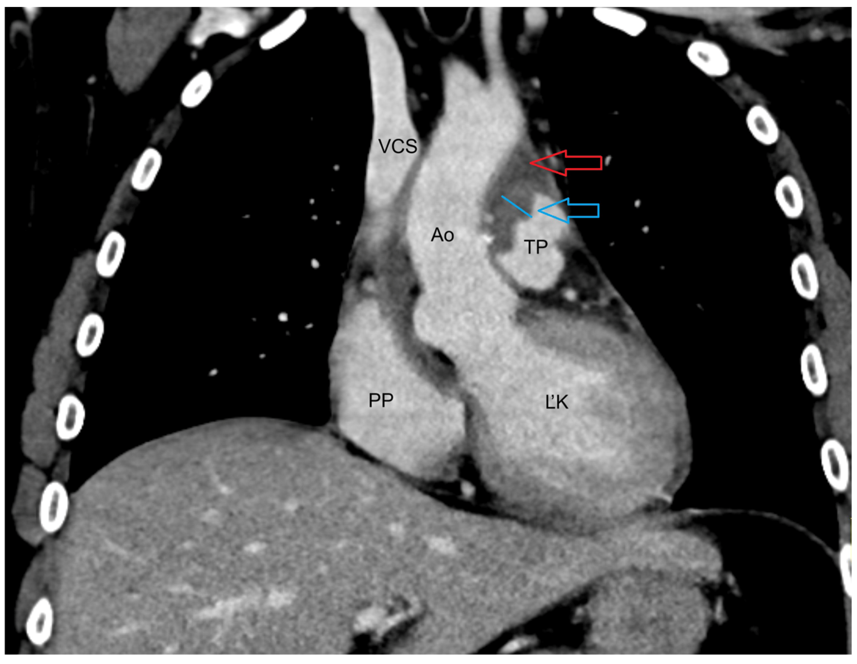 Figure 2. CT of the upper chest venous phase transverse plane: Blue arrow—fluid collection paraaortically to retrosternal with saturating wall, Red arrow—small air collection retrosternal in the fluid collection, Ao—aorta, TP—pulmonary trunk, VCS—superior vena cava, PP—right atrium, ĽK—left ventricule.