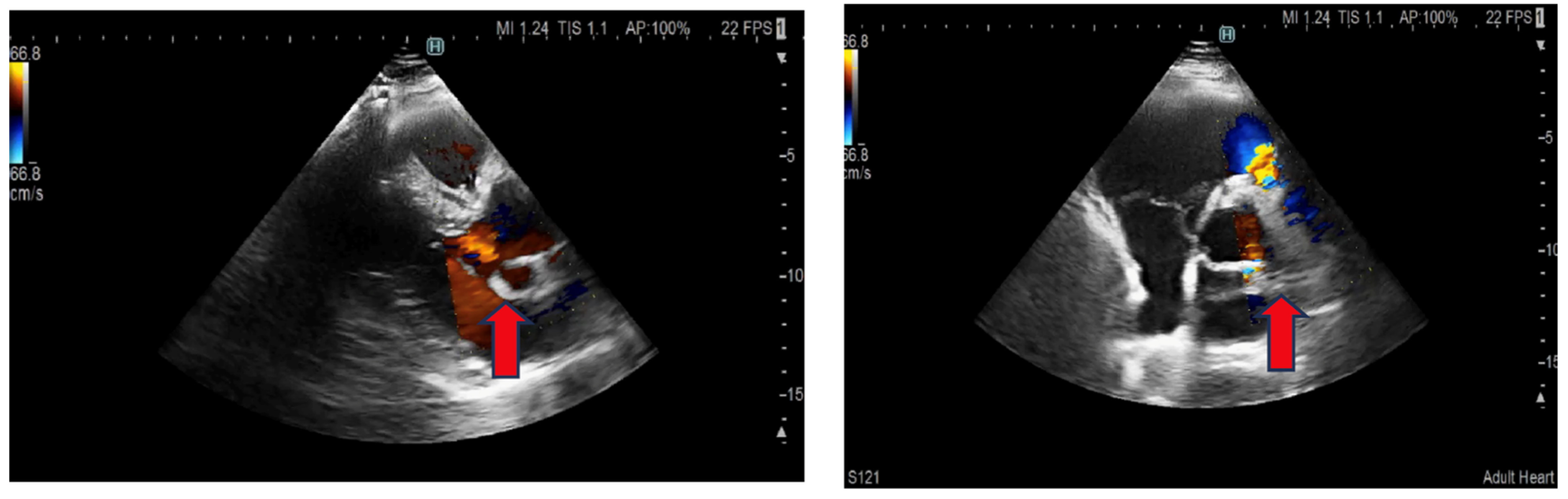 Figure 4. Transthoracic echocardiography: Parasternal long and short axis. The red arrow shows a pseudoaneurysm.