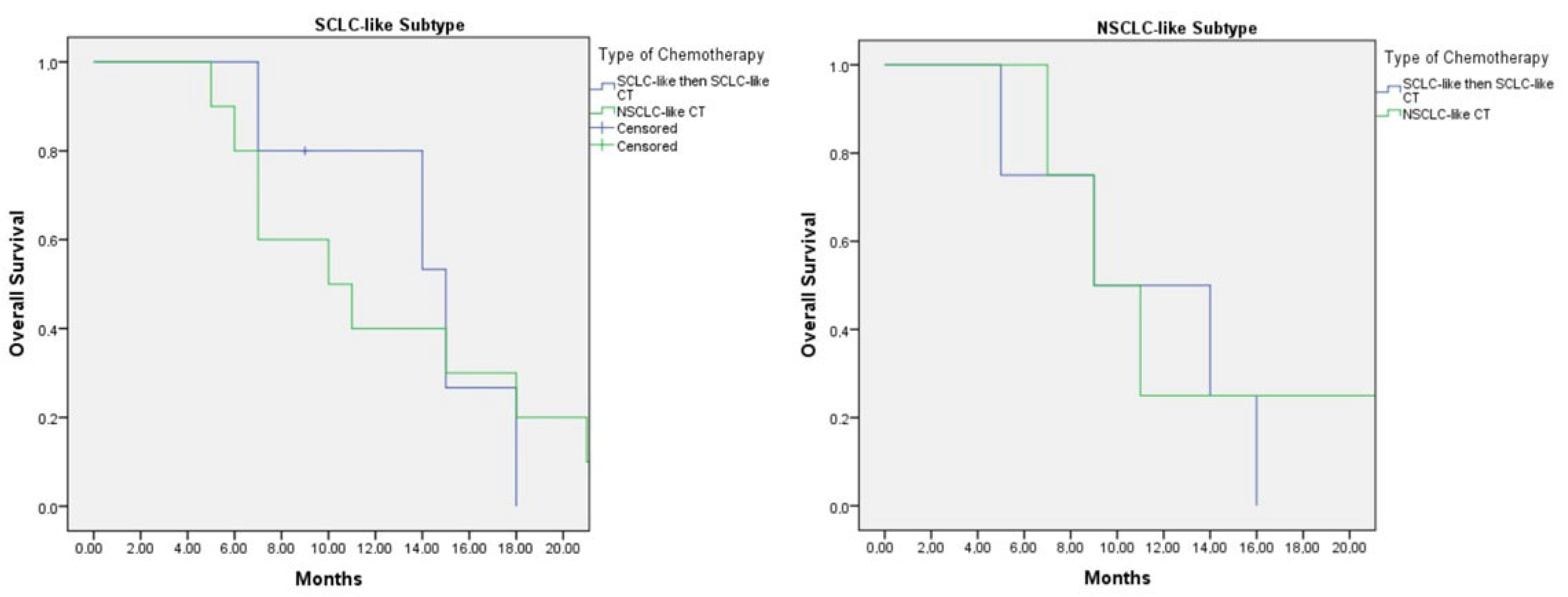 For patients with the NSCLC-like subtype, the median OS was 9.0 months (95% CI: 1.0–17.8) in those treated with two lines of SCLC-like chemotherapy, which was comparable to a median OS of 9.0 months (95% CI: 5.0–12.9) in those who received NSCLC-like chemotherapy at any line (