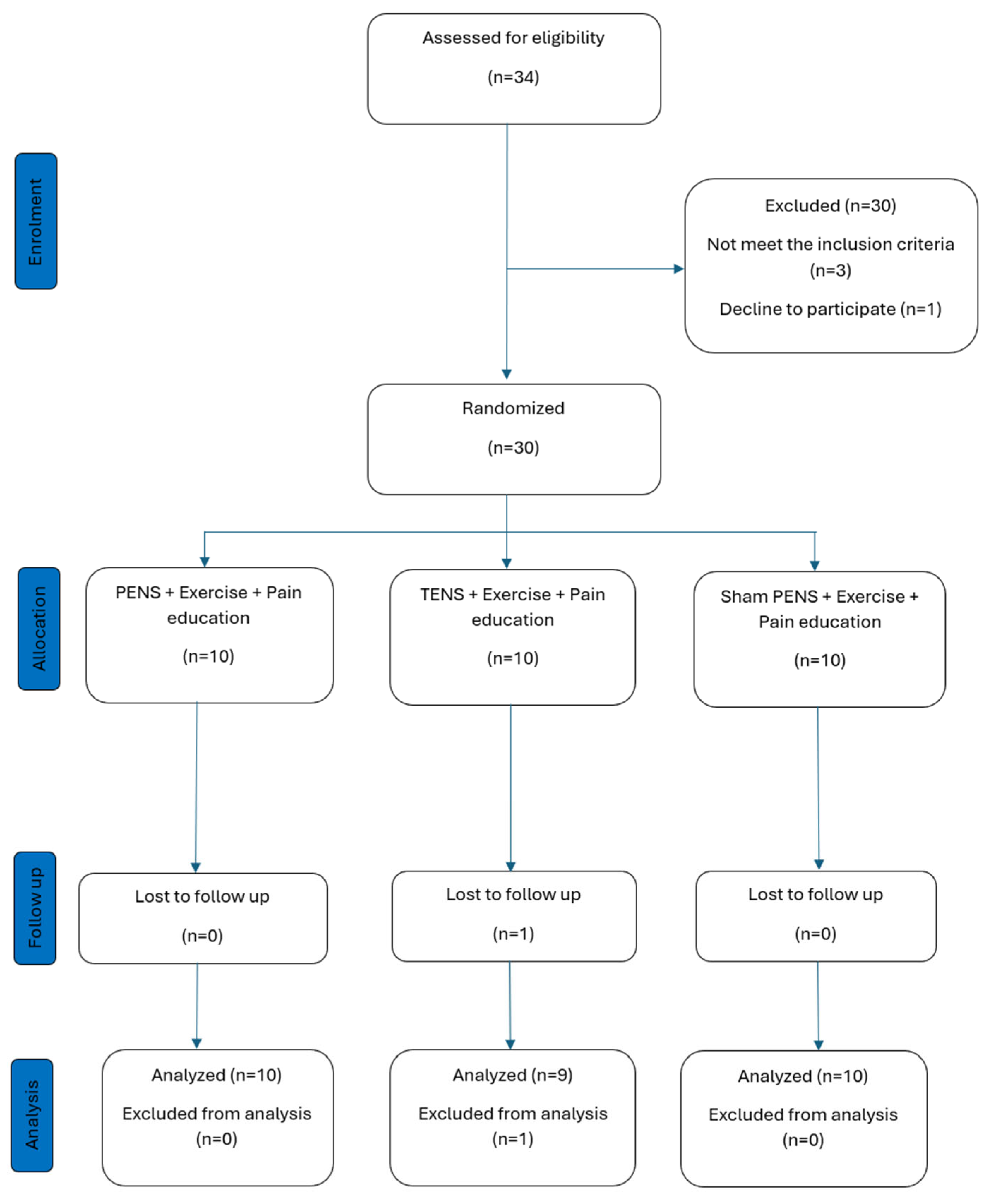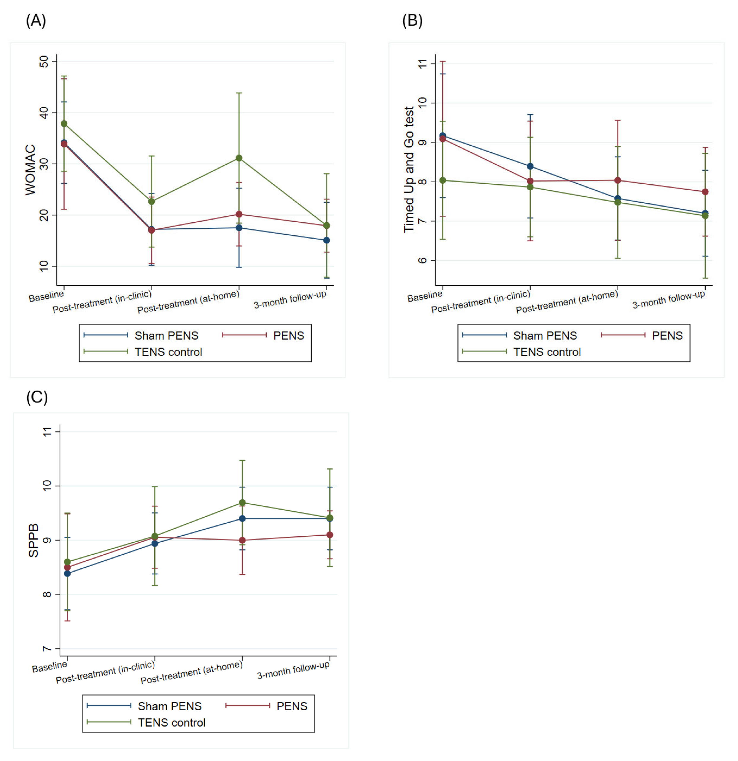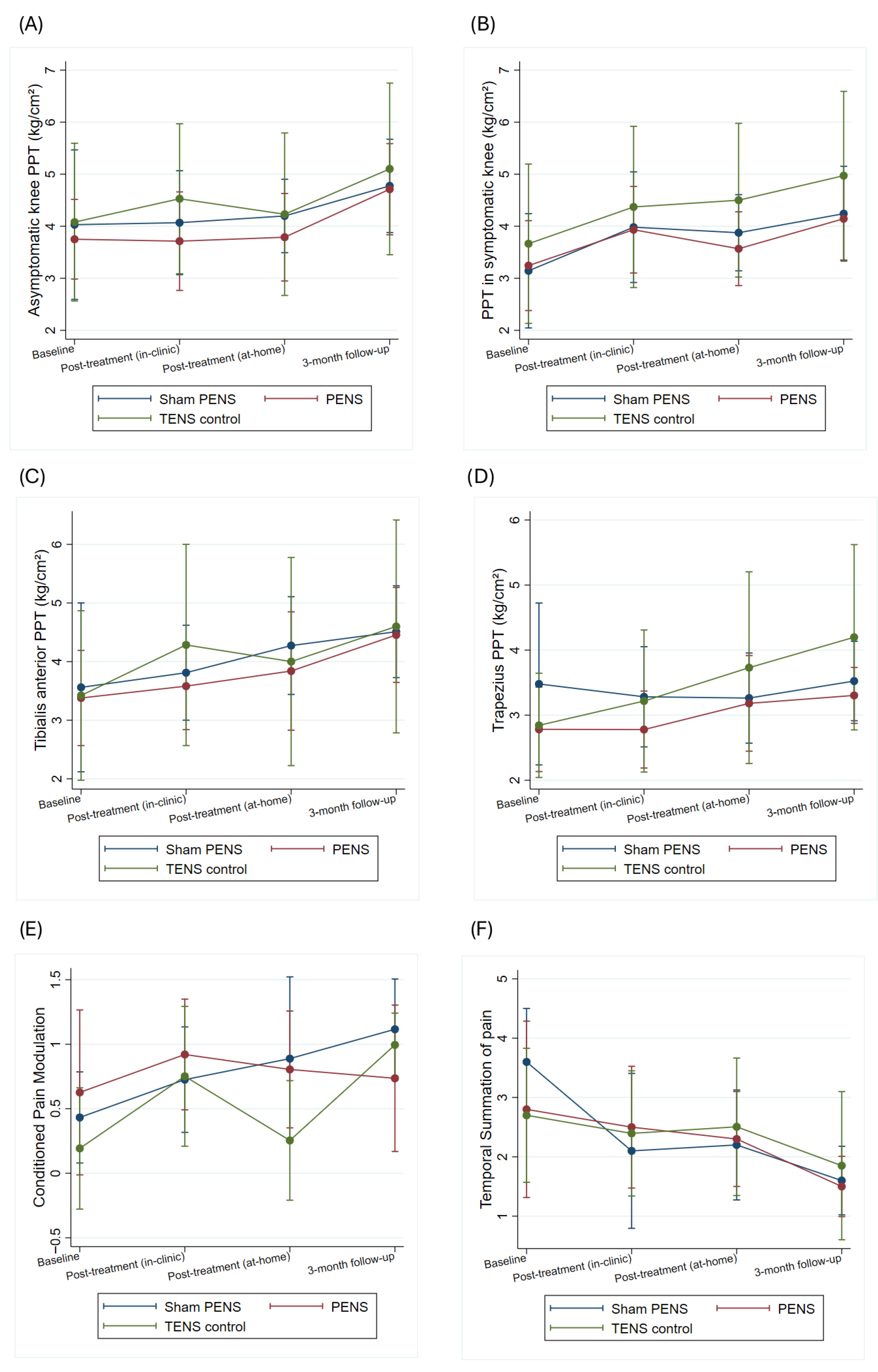 | PENS (n = 10) | Control TENS (n = 10) | Sham PENS (n = 10) | Differences Between Groups | ||