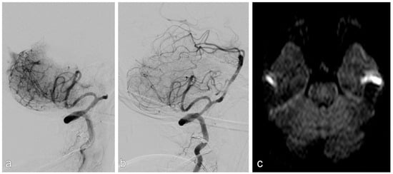 Patient with acute stroke due to acute occlusion of the basilar artery (a). After mechanical thrombectomy, there was a high-grade stenosis, which was stented successfully (b). There was no infarction on MRI upon discharge (c).
