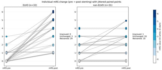 Individual modified Rankin scale (mRS) change before and after intracranial stenting in emergent ELVO and elective non-ELVO patients. Each line represents one patient, connecting the pre-event or pre-admission mRS (left) with the discharge mRS (right). Marker color encodes mRS severity, with mRS 0 shown in white and mRS 1–6 displayed in progressively darker blue shades. Lines are shown in medium gray to facilitate visual tracking of within-patient change.