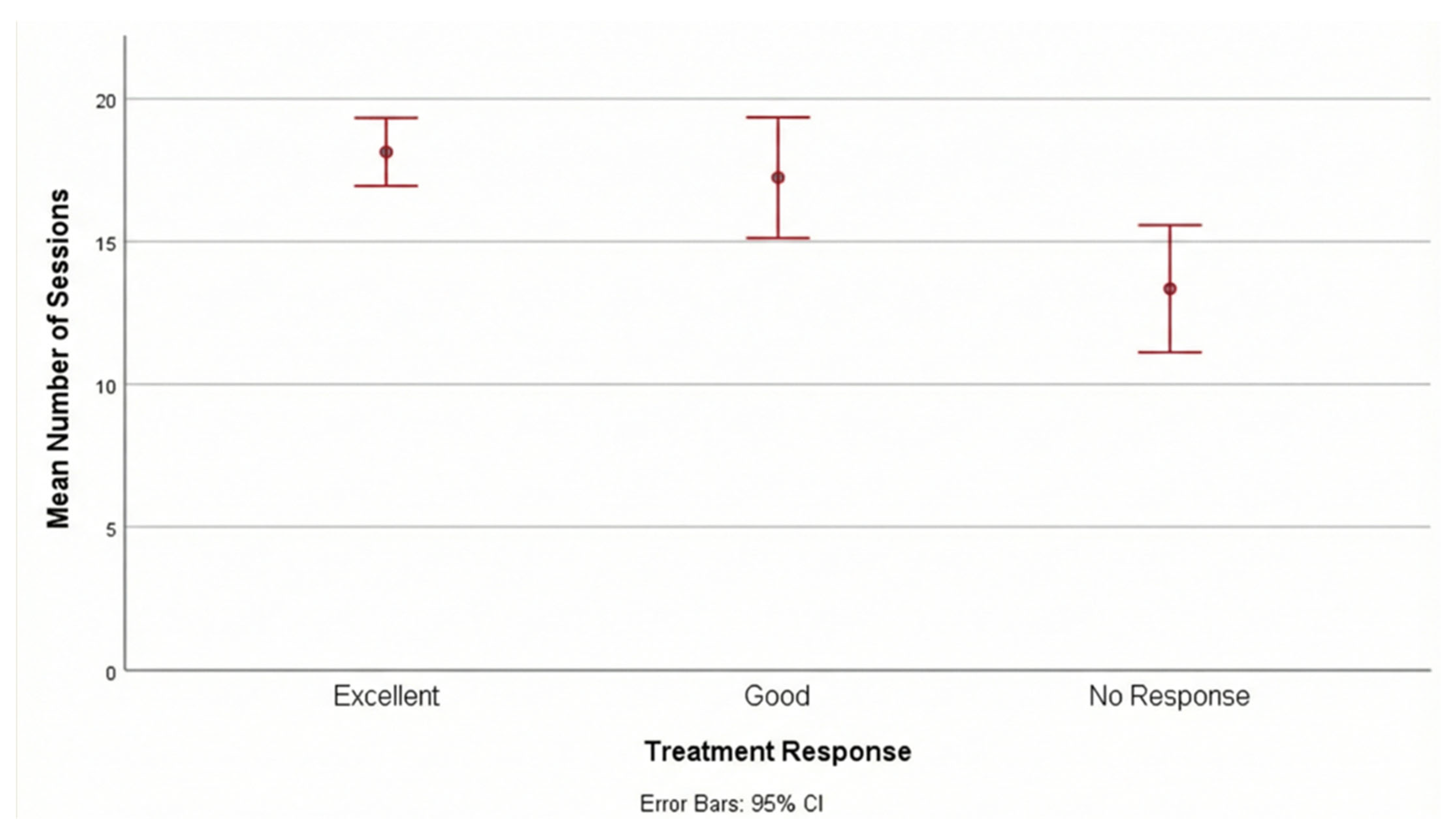 Figure 1 shows the mean number of sessions according to treatment response. This finding suggests that adherence to the treatment schedule and completion of a higher number of sessions are critical predictors of therapeutic success.
