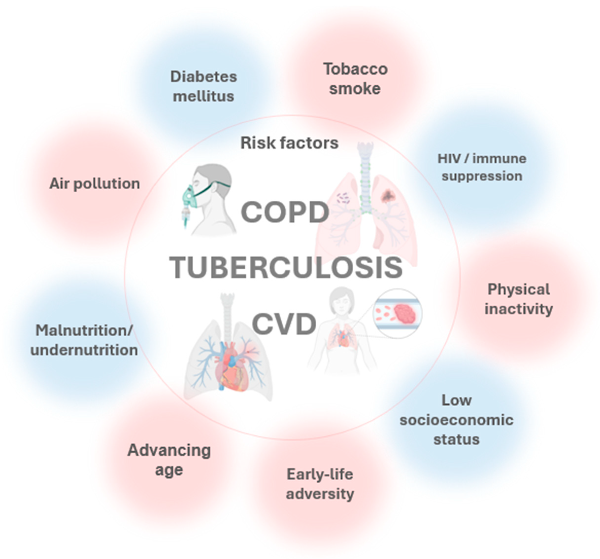 - Meghji, J.; Mortimer, K.; Mpangama, S. TB and COPD in Low-Income Settings: A Collision of Old Foes. Thorax 2021, 77, 1057–1058. [Google Scholar] [CrossRef] [PubMed]