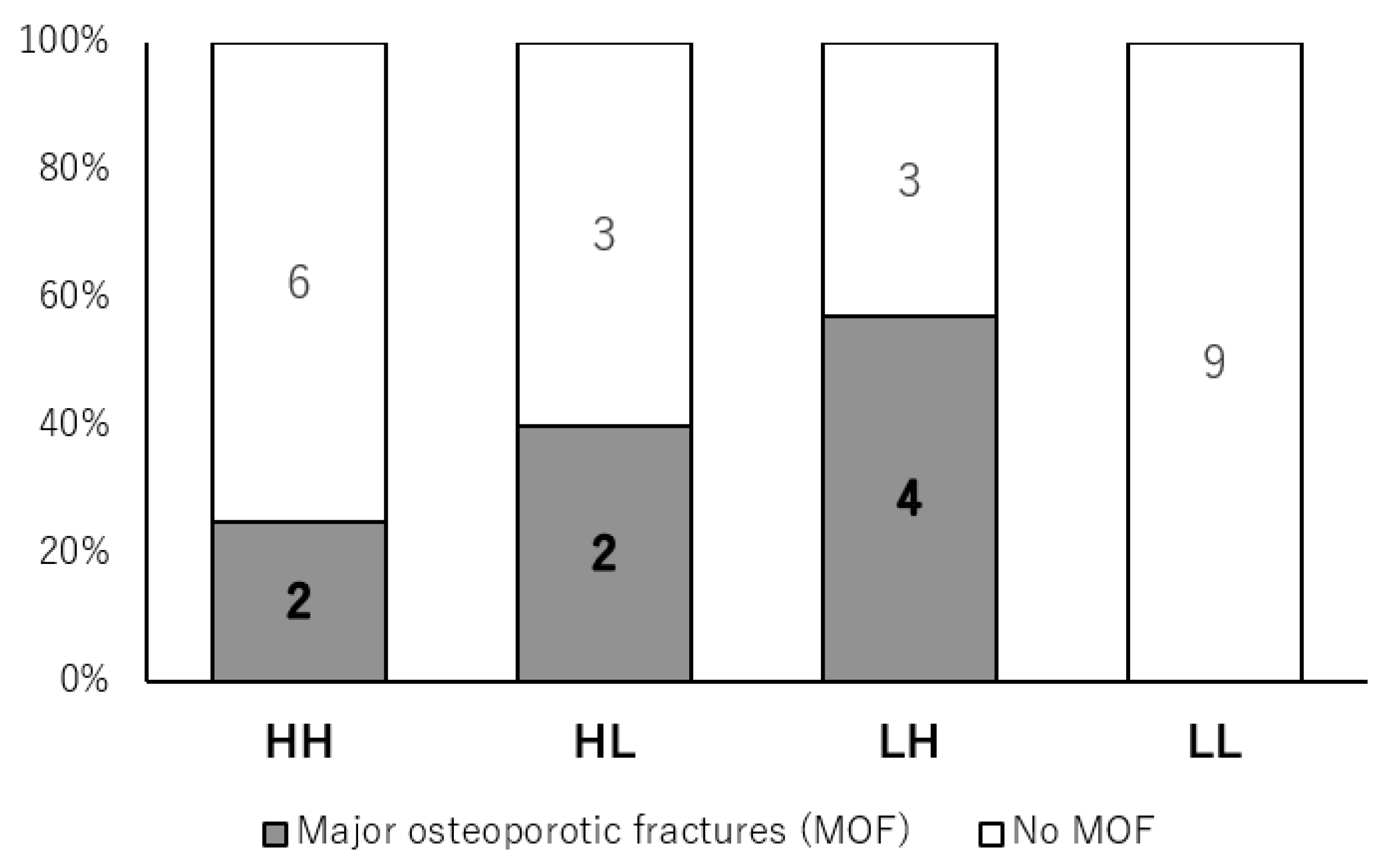 MOF incidence in each group was HH, 2/8 patients (25.0%); HL, 2/5 patients (40.0%); LH, 4/7 patients (57.1%); and LL, 0/9 patients (0.0%). Median follow-up durations were 9.6 years in the HH group, 3.0 years in the HL group, 10.9 years in the LH group, and 11.0 years in the LL group.