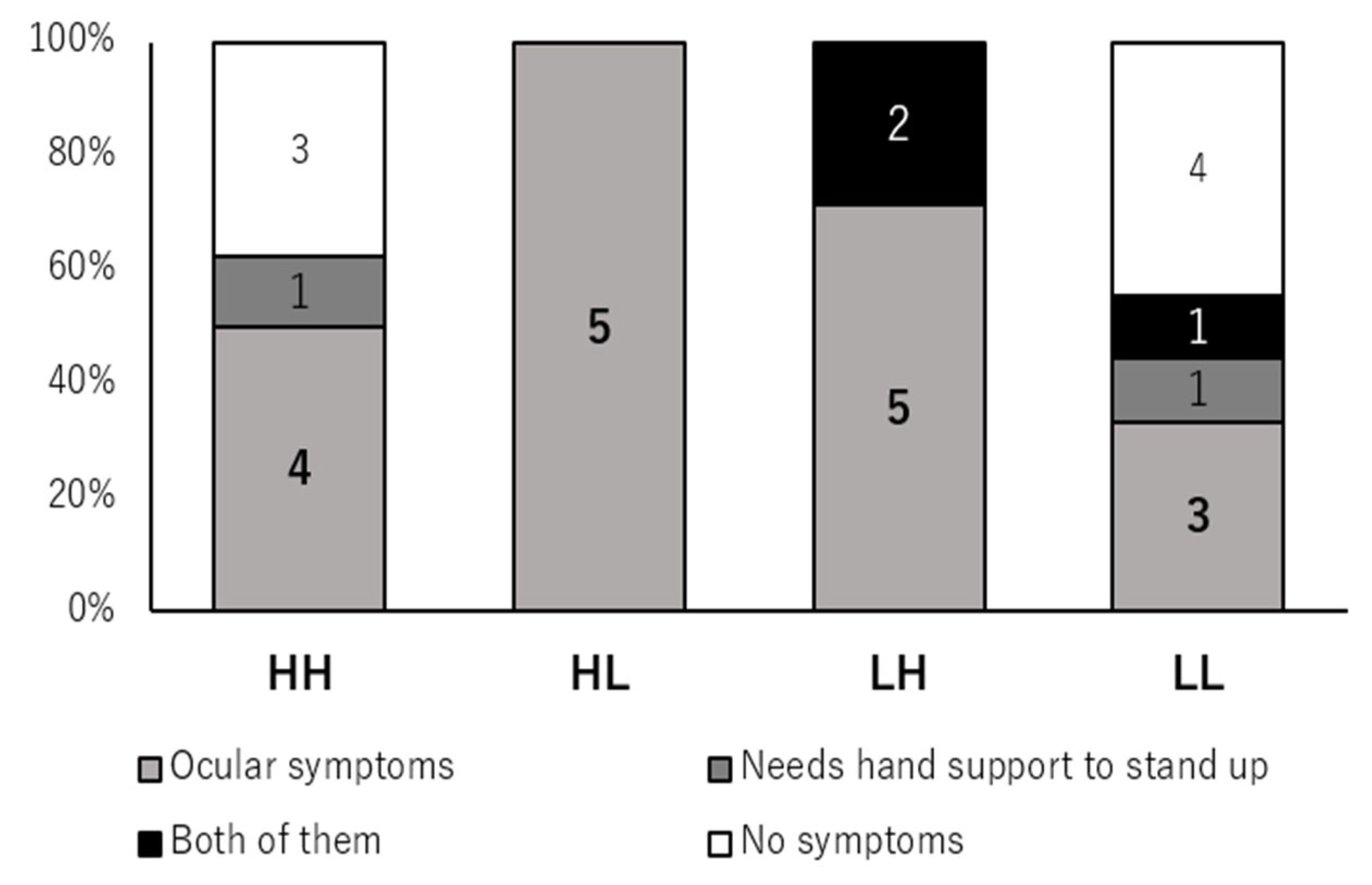 Fall-related MG-ADL impairments were more common in the HL and LH strata than in the LL stratum, and the LH group had the highest proportion of patients with at least one such impairment. In contrast, fall-related MG-ADL impairments were rare in the LL group, whose members largely achieved or approximated MSE, whereas the HH group showed a mixed pattern with some patients having ocular or proximal lower limb impairment and others not.