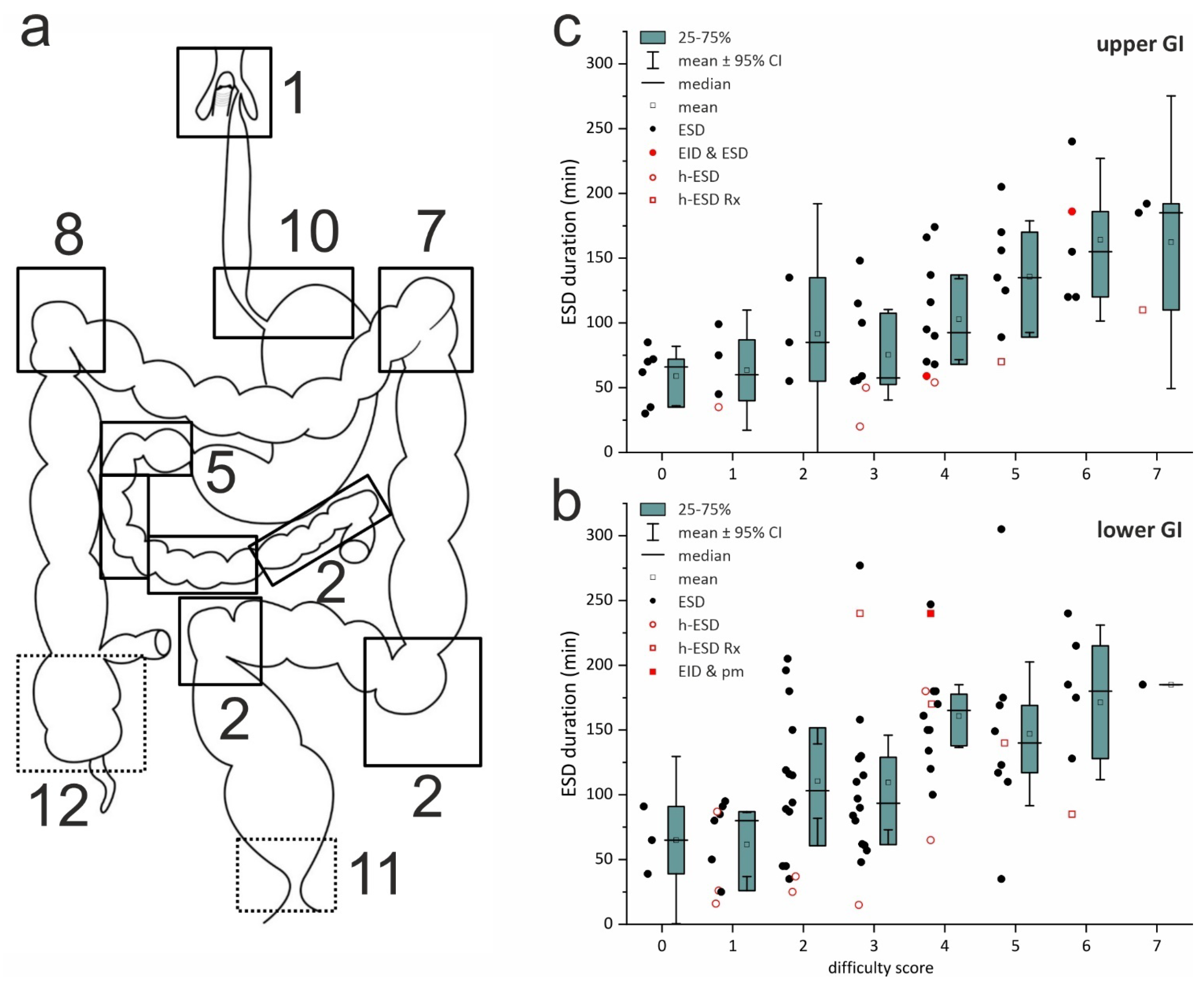 16]). The remaining 90 ESDs were performed by ESD beginners, with or without completion by tutors, in 20 tutoring sessions (each lasting 1–4 days, totaling 49 days). A contribution by the trainee of ≥25% of the total ESD duration was recorded in the register. ESD Clinical Tutoring is part of inpatient therapy and was offered free of charge to the trainees. We recommended endoscopy within ≤1 year and further follow-up (1–5 yrs) or additional therapy according to concurrent recommendations [