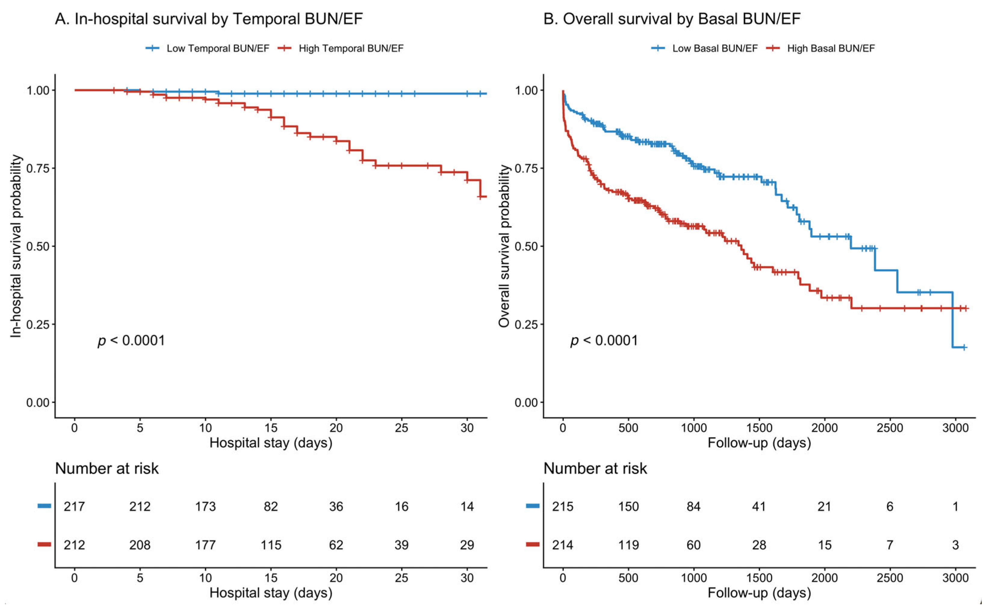 In contrast, during long-term follow-up, the baseline BUN/EF ratio was strongly associated with overall mortality (log-rank p < 0.0001, Figure 4B).