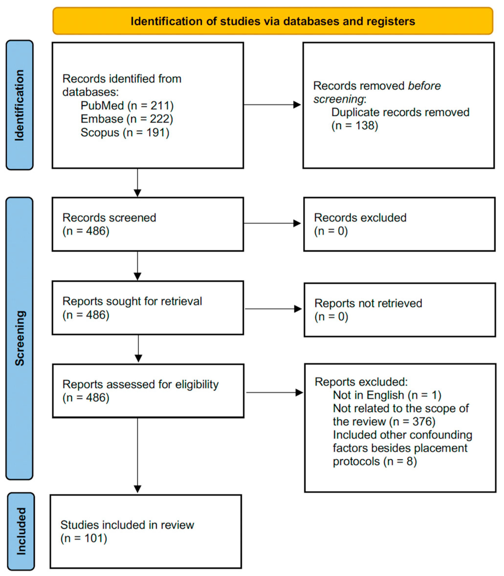 - Garcia-Sanchez, R.; Dopico, J.; Kalemaj, Z.; Buti, J.; Pardo Zamora, G.; Mardas, N. Comparison of clinical outcomes of immediate versus delayed placement of dental implants: A systematic review and meta-analysis. Clin. Oral Implant. Res. 2022, 33, 231–277. [Google Scholar] [CrossRef]