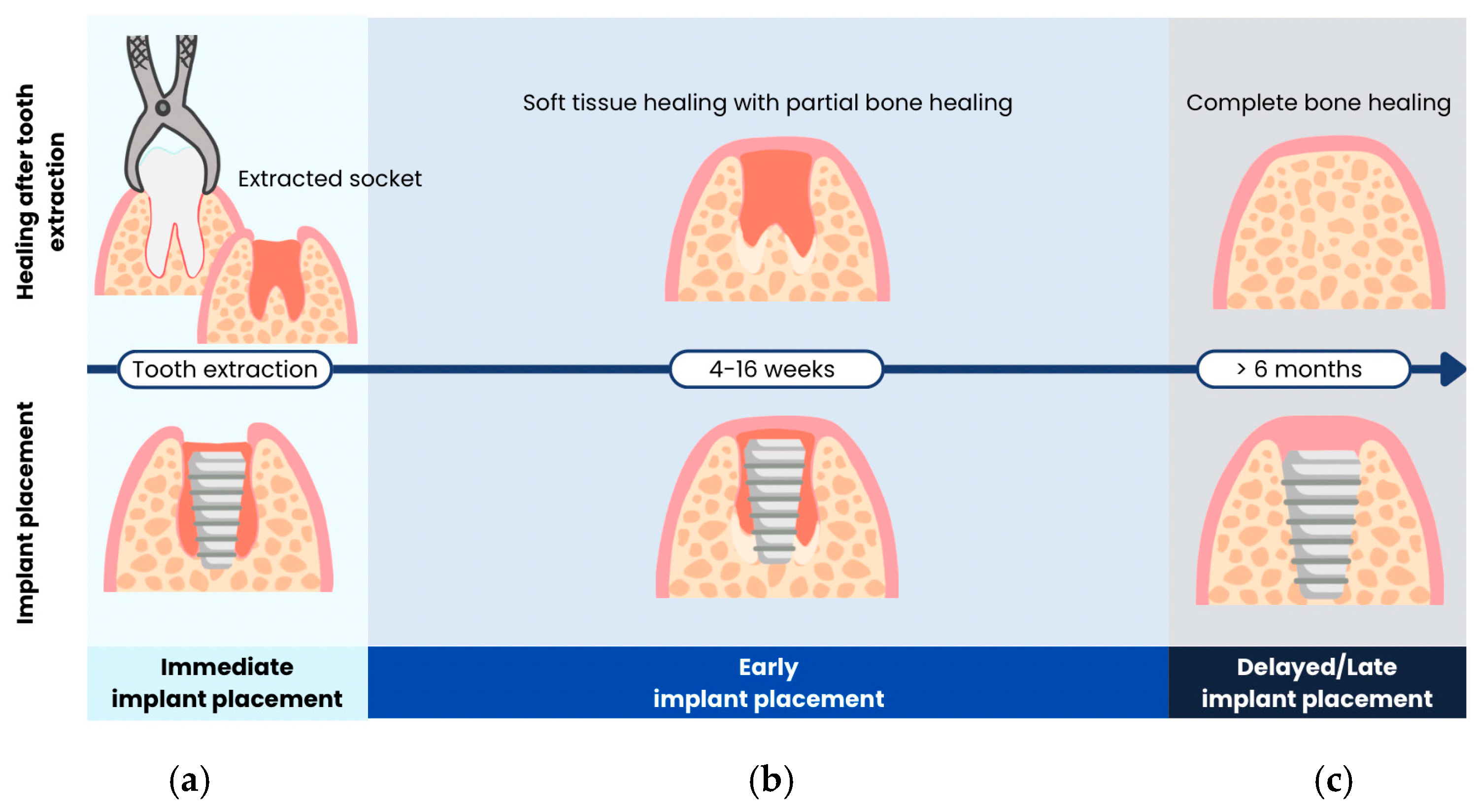 - Early implant placement: dental implants are placed with soft tissue healing (4–8 weeks) or with partial bone healing (12–16 weeks) after tooth extraction.