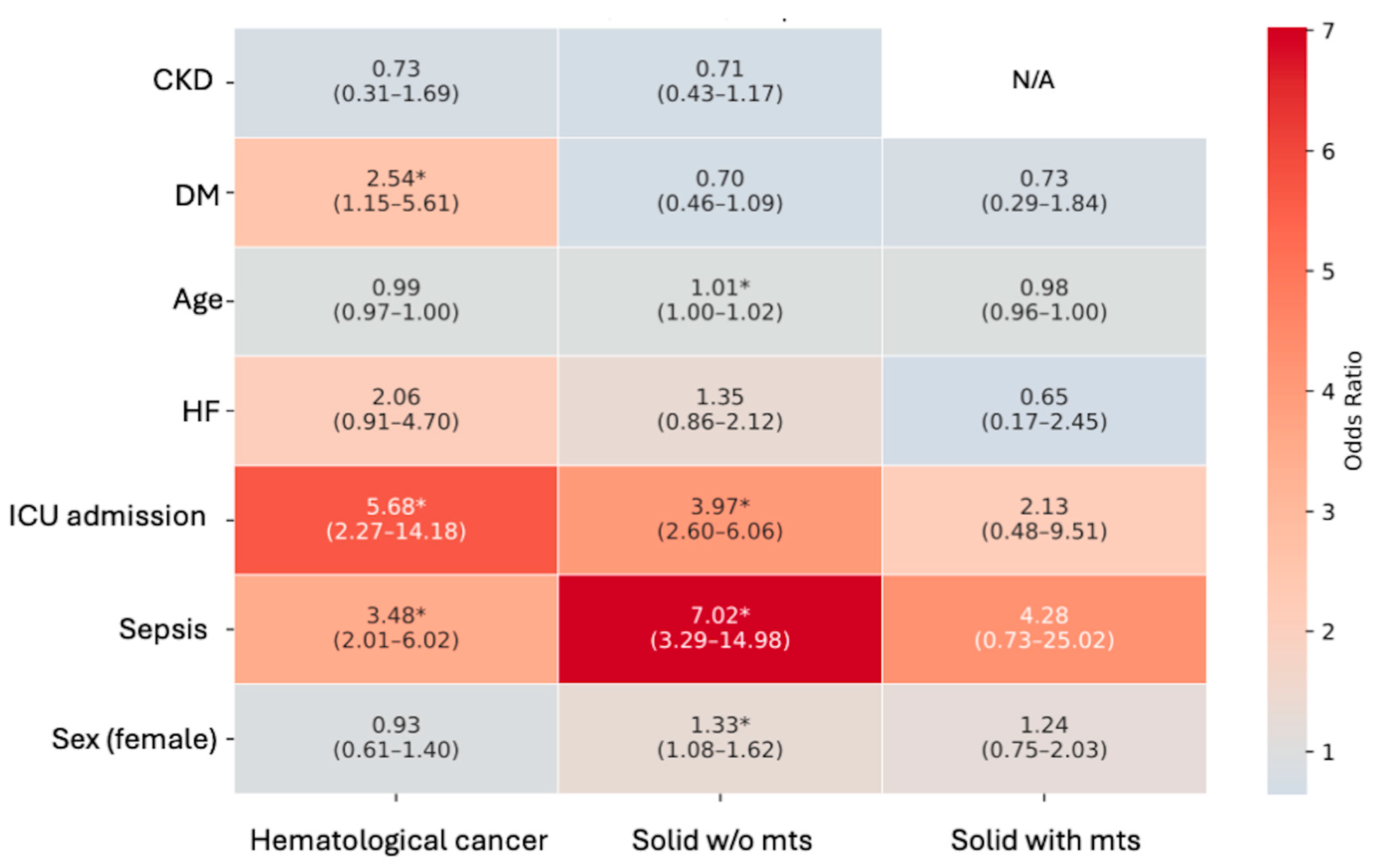 DM prevalence did not differ significantly across cancer types. HF was more frequent in non-metastatic solid cancer, while CKD prevalence was highest among hematologic patients (9.6% vs. 6.1% and 2.7%, p < 0.001), who also showed the highest sCr levels at admission (1.39 ± 1.21 mg/dL). Sepsis occurred far more commonly in hematologic cancers (19.5%) compared with solid cancers with or without metastases. Detailed characteristics are reported in Table 2.