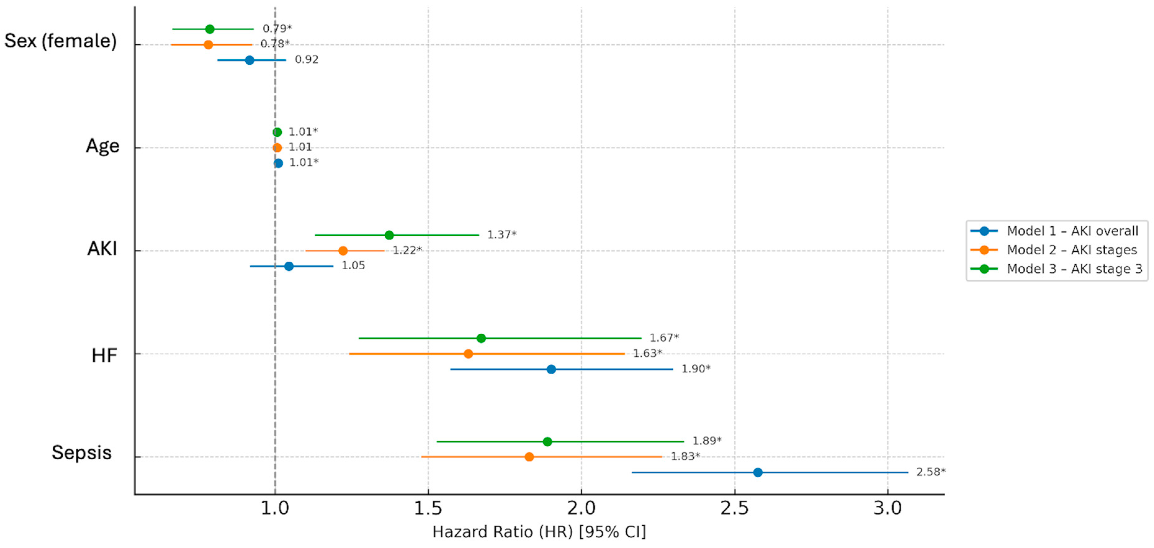 Abbreviations: HR = Hazard Ratio, CI = Confidence Interval, AKI = Acute Kidney Injury * p < 0.05, § p ≤ 0.001.