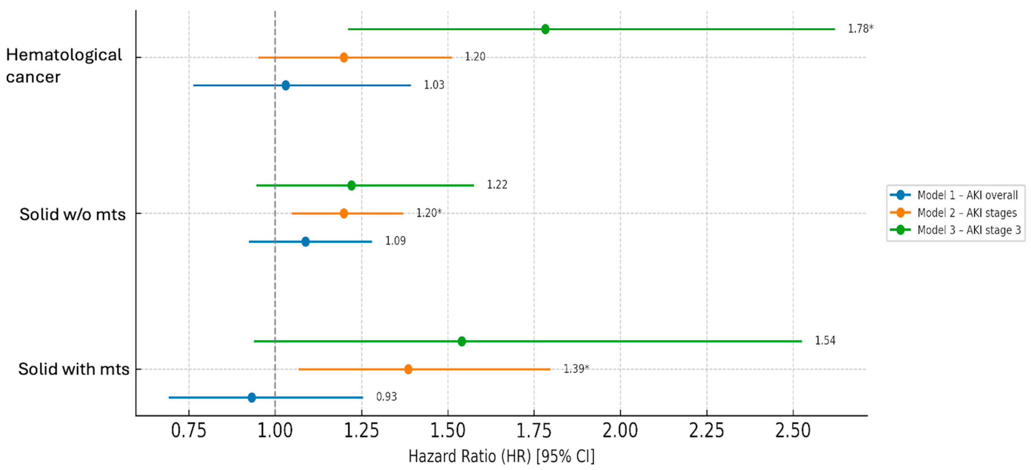 The absence of urine output data is particularly relevant among cancer patients, in whom serum creatinine may be an unreliable diagnostic marker due to malnutrition, sarcopenia, and physical inactivity. This limitation, however, is common to much of the current AKI epidemiological literature [38]. In addition, the category of metastatic solid tumors is intrinsically heterogeneous, as metastatic involvement of different organs may confer markedly different AKI risk profiles. For example, liver or kidney metastases are likely to have a different impact on renal function compared with metastases to other sites [39]. Furthermore, since the original hospital data report system was not specifically designed for this analysis, detailed information on cancer staging, metastatic burden, specific causes of AKI, and oncologic treatment regimens was unavailable. This limitation is particularly relevant given the nephrotoxic potential of several anticancer therapies or procedures, including platinum-based chemotherapy and immune checkpoint inhibitors, and exposure to iodinated contrast media [40]. Future prospective studies should incorporate these variables, especially considering the rapidly evolving oncologic treatment landscape.