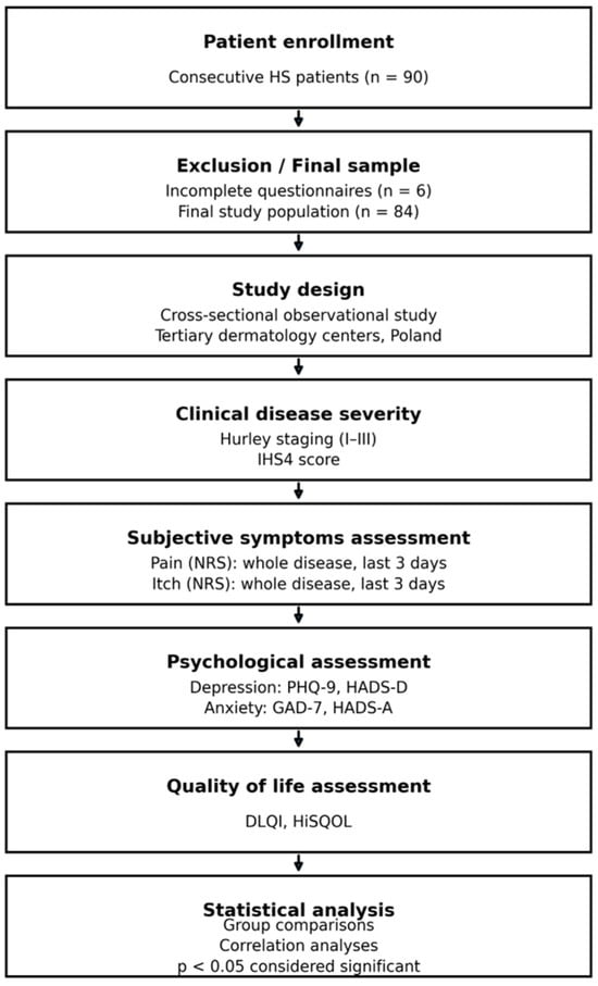 This was a cross-sectional observational study conducted among patients with HS. The diagnosis of HS was based on clinical examination by experienced dermatologists, in accordance with established diagnostic criteria [1]. Consecutive patients were recruited during routine dermatological consultations at tertiary referral centers in two cities in Poland: Wroclaw and Cracow. Demographic data collected included age, sex and disease duration. Clinical variables were asssessed by dermatologists and included disease severity. Subjective symptoms, such as pain and itch intensity, were scored by patients. Patients were also asked to fill out questionnaires related to psychological status (depression and anxiety) as well as QoL. All questionnaires were completed independently by the participants during the study visit, with assisstance available if clarification was needed. The study was carried out between June and November 2025. The study design is presented in Figure 1.