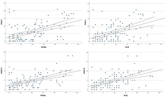 Additionally, we found a positive correlation between PHQ-9 scores and QoL assessments, both DLQI and HiSQOL (r = 0.530, p < 0.001 and r = 0.566, p < 0.001, respectively). HADS-D scores also correlated significantly with DLQI (r = 0.476, p < 0.001) and HiSQOL (r = 0.474, p < 0.001) (Figure 3).