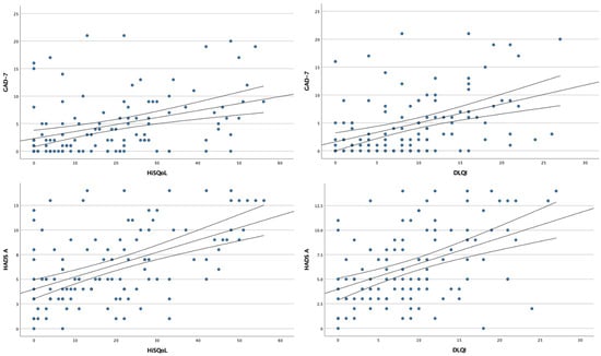 Similar to PHQ-9, significant correlations were found between GAD-7 scores and DLQI (r = 0.472, p < 0.001) as well as HiSQOL (r = 0.468, p < 0.001). The same was observed for HADS-A scores, which correlated with both DLQI and HiSQOL (r = 0.437, p < 0.001 and r = 0.494, p < 0.001, respectively) (Figure 5). No statistically significant correlations (p > 0.05) were found between depression/anxiety questionnaire scores and disease duration.