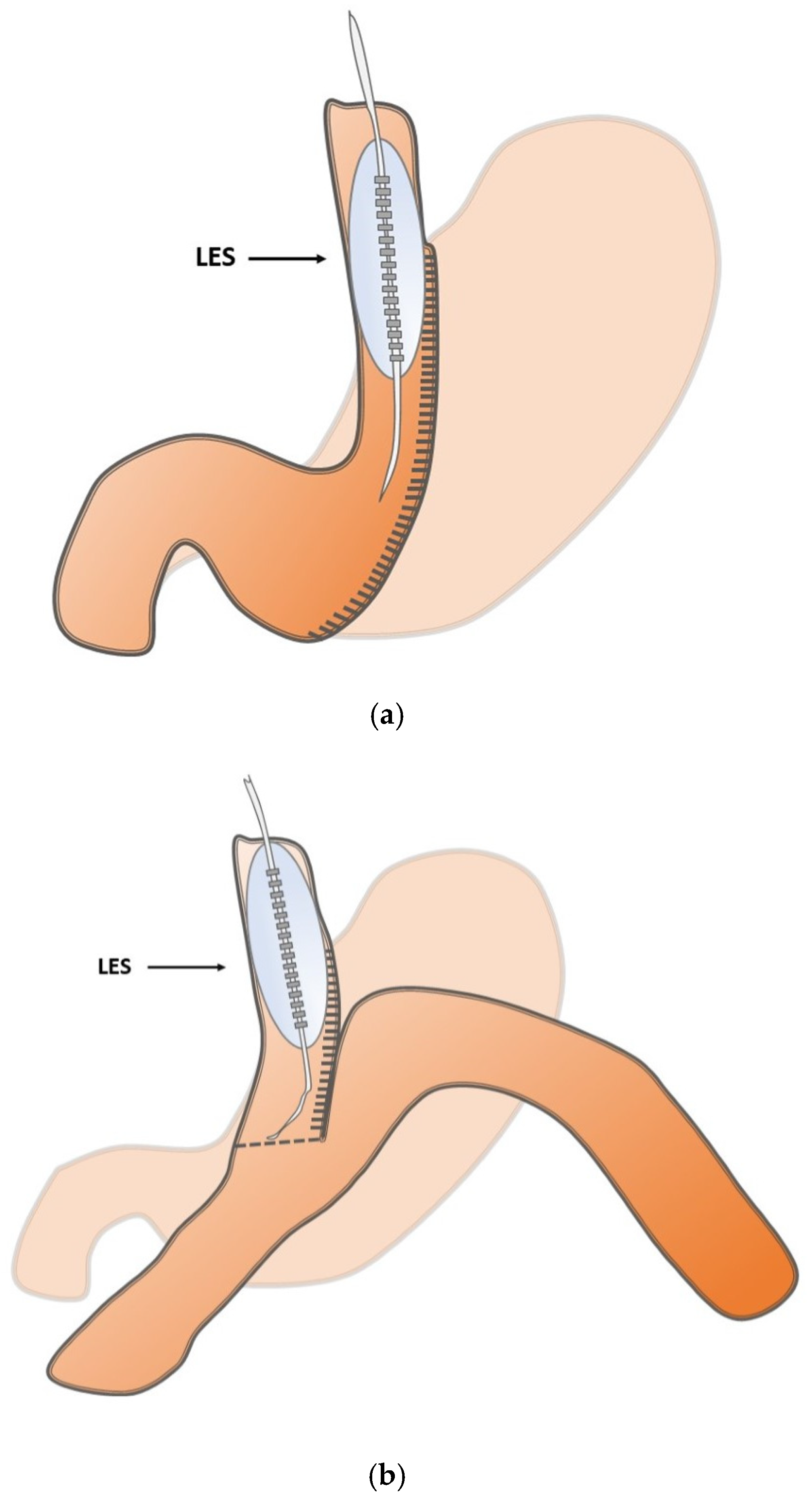 - Reynolds, J.L.; Zehetner, J.; Shiraga, S.; Lipham, J.C.; Katkhouda, N. Intraoperative assessment of the effects of laparoscopic sleeve gastrectomy on the distensibility of the lower esophageal sphincter using impedance planimetry. Surg. Endosc. 2016, 30, 4904–4909. [Google Scholar] [CrossRef]