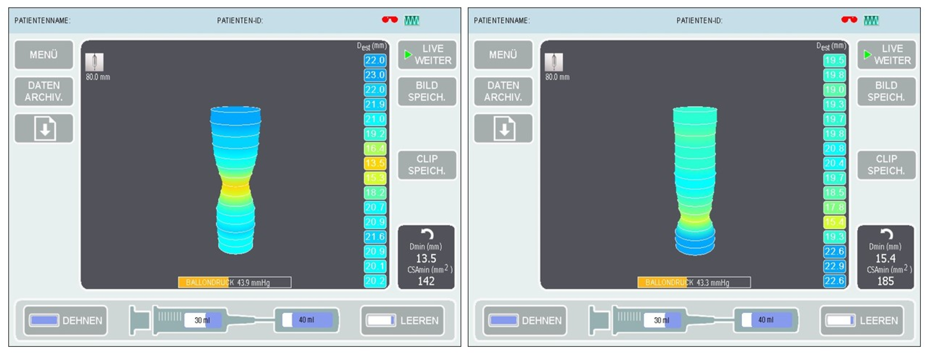 The balloon was then filled with saline to a volume of 40 mL and measurements were taken (Figure 3) at the expiratory endpoint in a 30° anti-Trendelenburg position after releasing the pneumoperitoneum with a calibration period of 30 s. The EndoFLIP™ was removed thereafter and an endoscopic air leak test was performed.