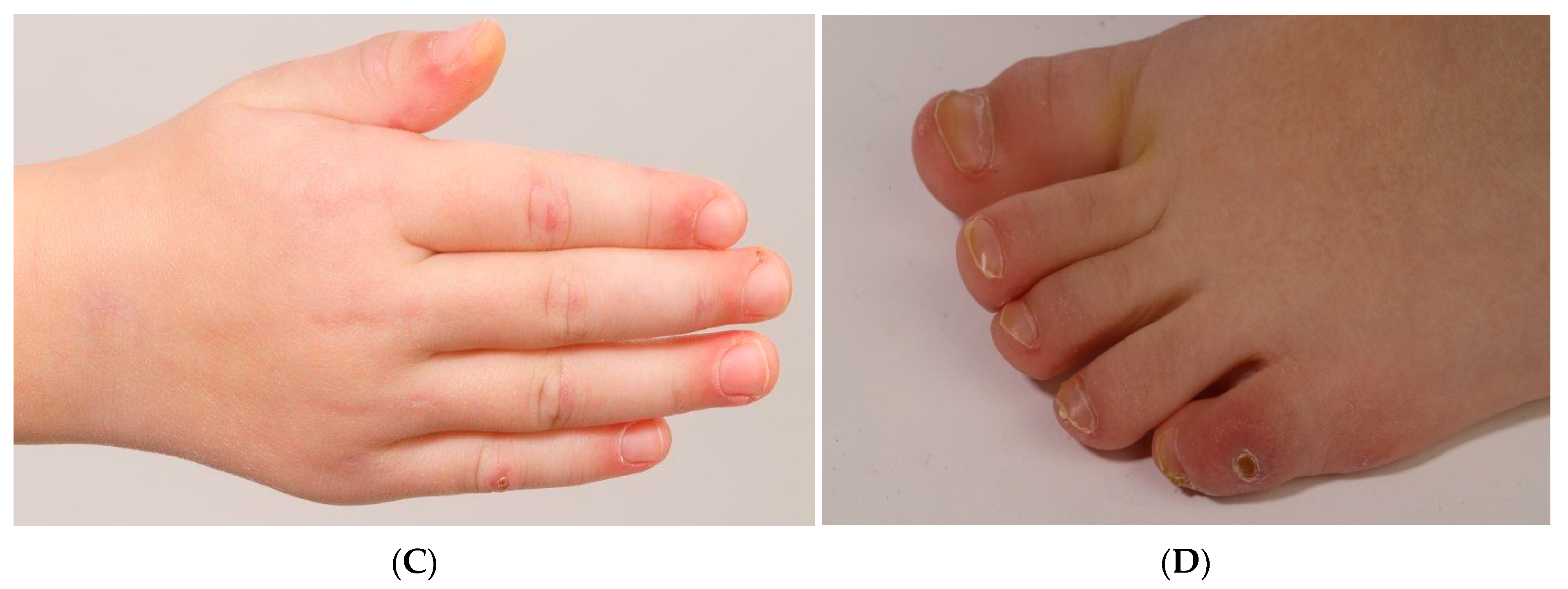 - Quintana-Ortega, C.; Remesal, A.; Ruiz de Valbuena, M.; de la Serna, O.; Laplaza-Gonzalez, M.; Alvarez-Rojas, E.; Udaondo, C.; Alcobendas, R.; Murias, S. Fatal outcome of anti-MDA5 juvenile dermatomyositis in a paediatric COVID-19 patient: A case report. Mod. Rheumatol. Case Rep. 2021, 5, 101–107. [Google Scholar] [CrossRef] [PubMed]