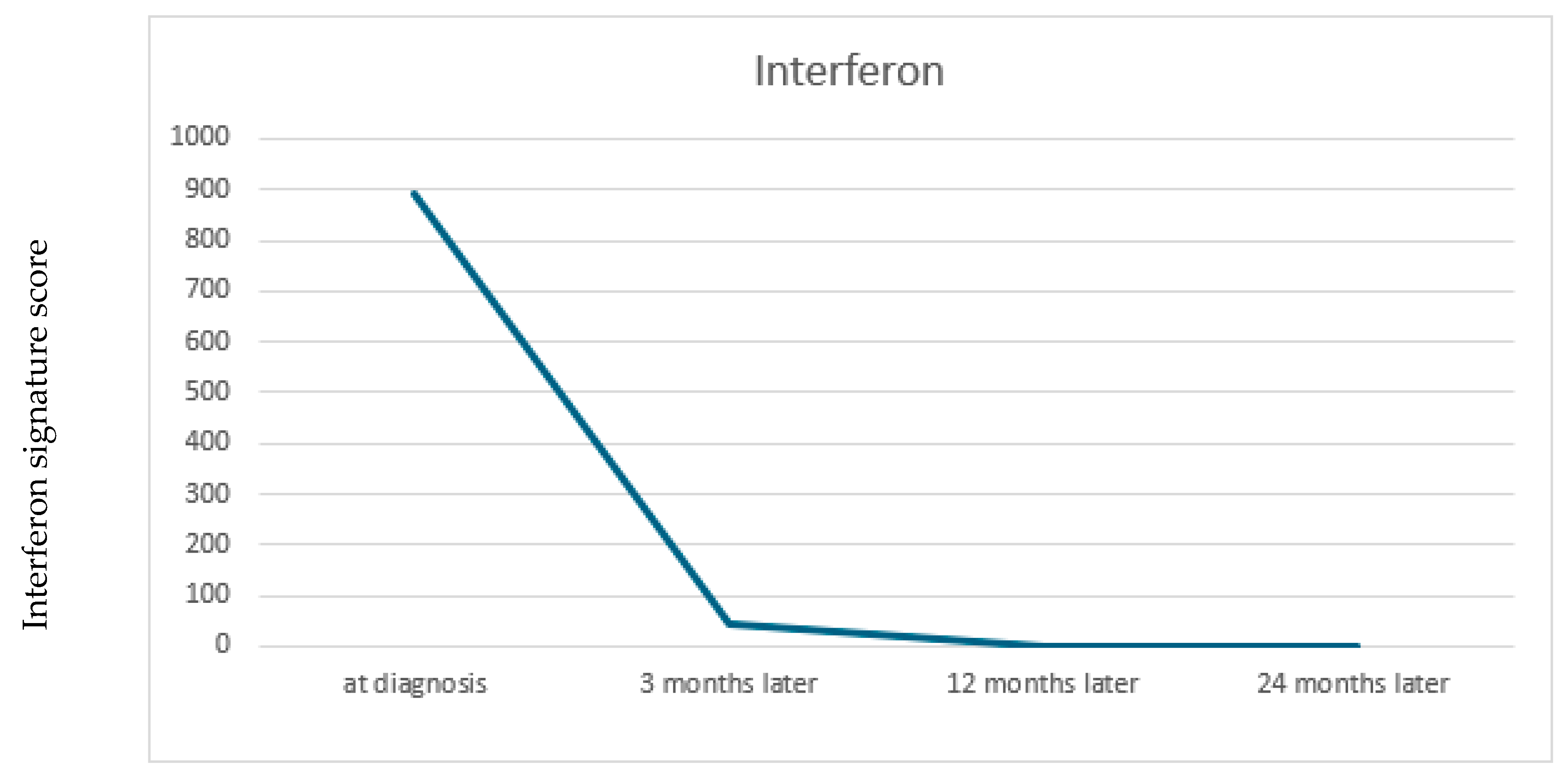 - Heinen, A.; Schnabel, A.; Bruck, N.; Smitka, M.; Wolf, C.; Lucas, N.; Dollinger, S.; Hahn, G.; Gunther, C.; Berner, R.; et al. Interferon signature guiding therapeutic decision making: Ruxolitinib as first-line therapy for severe juvenile dermatomyositis? Rheumatology 2021, 60, e136–e138. [Google Scholar] [CrossRef]
