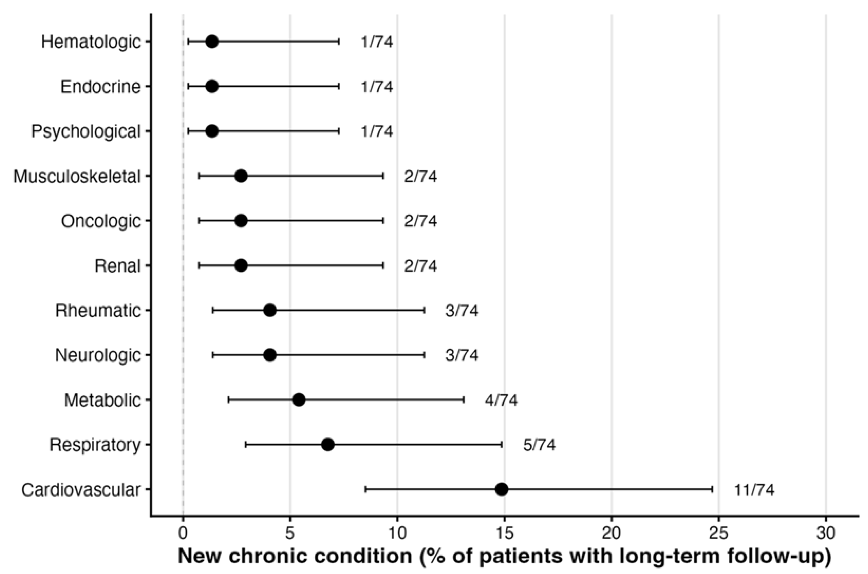 | New oncologic disease | 74/2 | 2.7% [0.7–9.3%] |