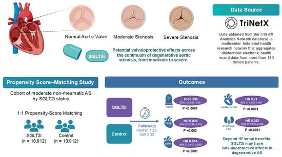 - Shah, T.; Zhang, Z.; Shah, H.; Fanaroff, A.C.; Nathan, A.S.; Parise, H.; Lutz, J.; Sugeng, L.; Bellumkonda, L.; Redfors, B.; et al. Effect of Sodium-Glucose Cotransporter-2 Inhibitors on the Progression of Aortic Stenosis. JACC Cardiovasc. Interv. 2025, 18, 738–748. [Google Scholar] [CrossRef] [PubMed]