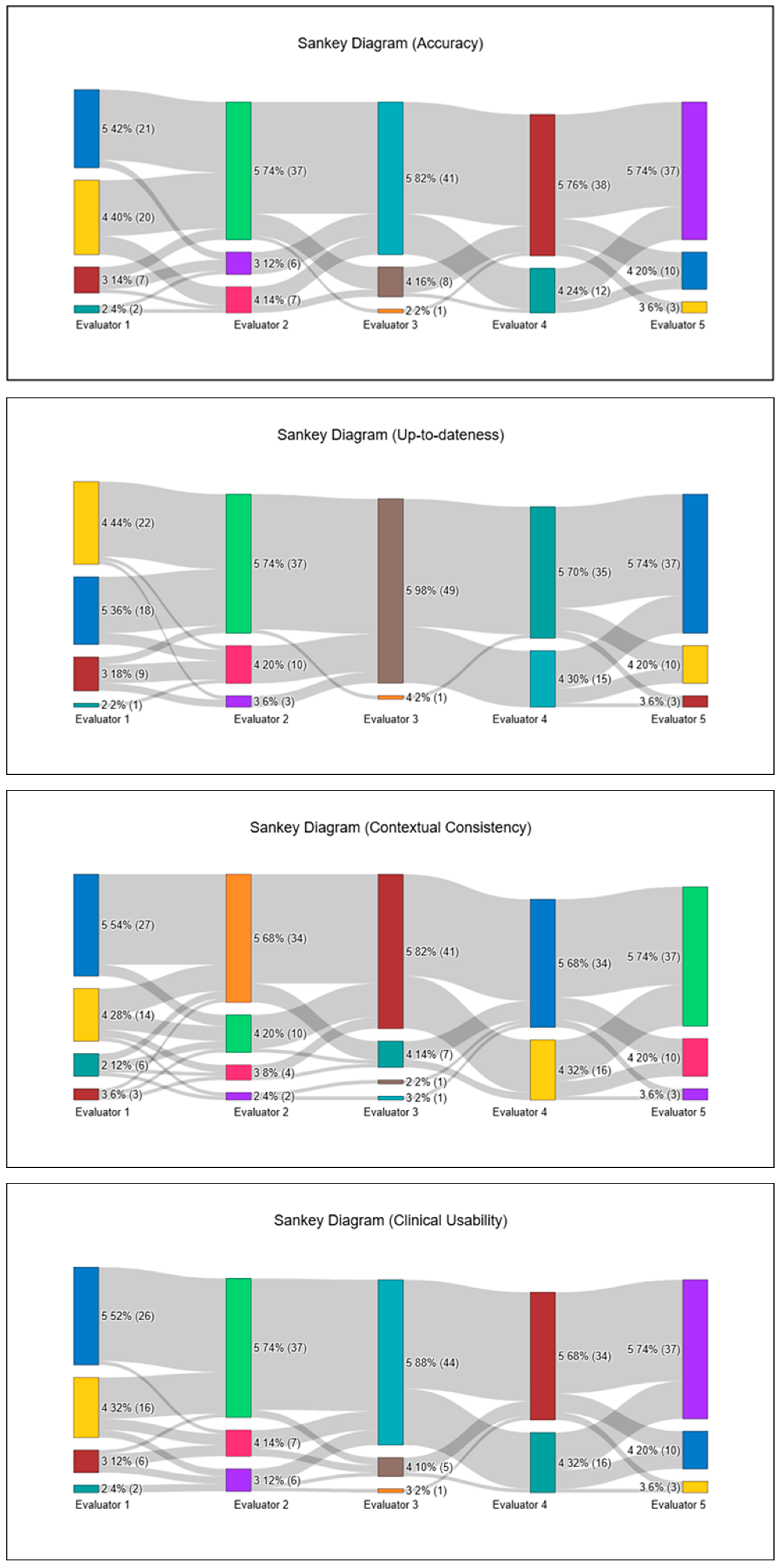Across the 250 individual ratings per domain, the proportion of satisfactory scores (4–5) exceeded 90% in all categories, with the highest proportions observed in Clarity (94.4%), Up-to-dateness (93.6%), Clinical Usability (92.8%), Accuracy (92.4%), and Contextual Consistency (92.0%), with Trustworthiness similarly high (90.8%).