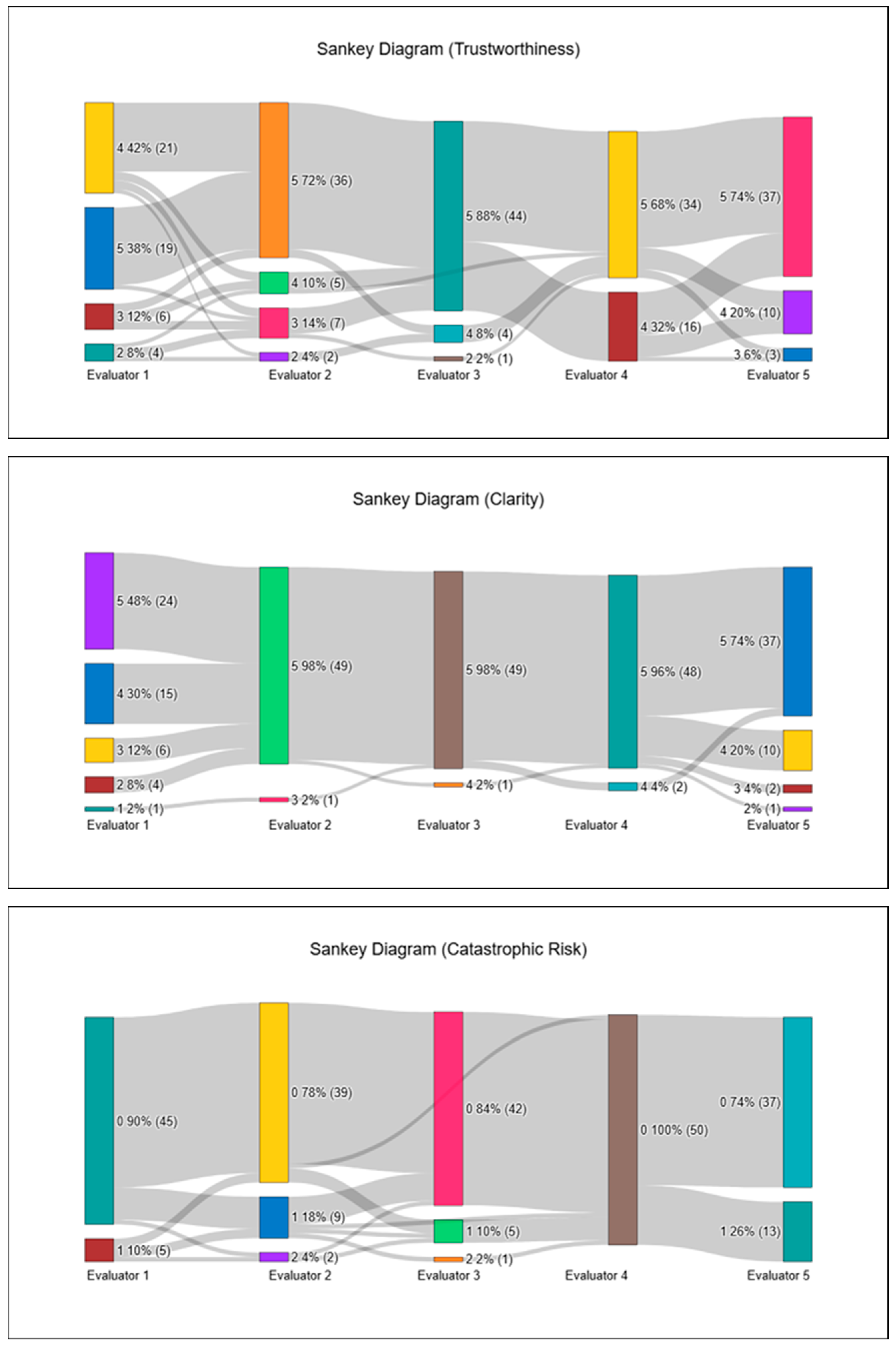 Figure 1. Sankey diagrams illustrating evaluator scoring patterns across all ARQuAT content-quality domains and catastrophic-risk assessments.