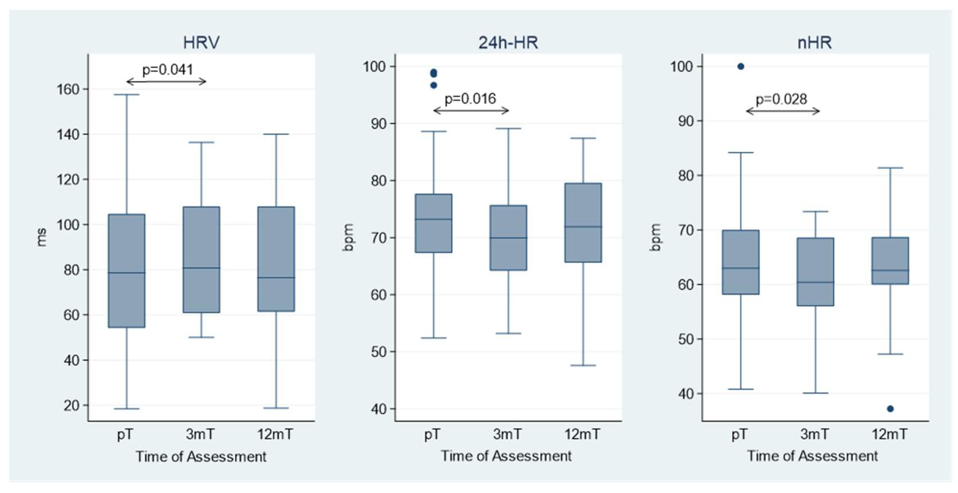 - decreased 24 h-HR (pT: 73.2 bpm [67.3–77.7] vs. 3 mT: 69.9 bpm [64.2–75.7]; p = 0.016);
